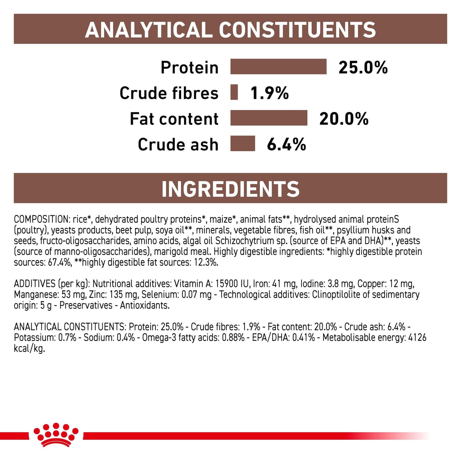 Composition: Rice, dehydrated poultry protein, maize, animal fats, hydrolysed animal proteins (poultry, fish), egg powder, yeasts products, beet pulp, soya oil, fish oil, vegetable fibres, minerals, psyllium husks and seeds, fructo-oligosaccharides (0.5%), hydrolysed yeast (source of mannan-oligosaccharides) (0.2%), marigold extract (source of lutein). Additives (per kg): Nutritional additives: Vitamin A: 16500 IU, Vitamin D3: 1000 IU, Iron: 41 mg, Iodine: 4.1 mg, Copper: 12 mg, Manganese: 53 mg, Zinc: 129mg, Selenium: 0.07 mg - Technological additives: Clinoptilolite of sedimentary origin: 5 g - Preservatives - Antioxidants Please Note: Royal Canin takes pride in ensuring the scientific reliability of all product information. The information in this product listing was true and accurate at the time of publication. However, please note that from time to time, for example due to ingredient availability or a change in sourcing factory within our global factory network for the purpose of ongoing supply, it is necessary to make product changes at short notice, and there may be some delays in updating the information in our product materials.