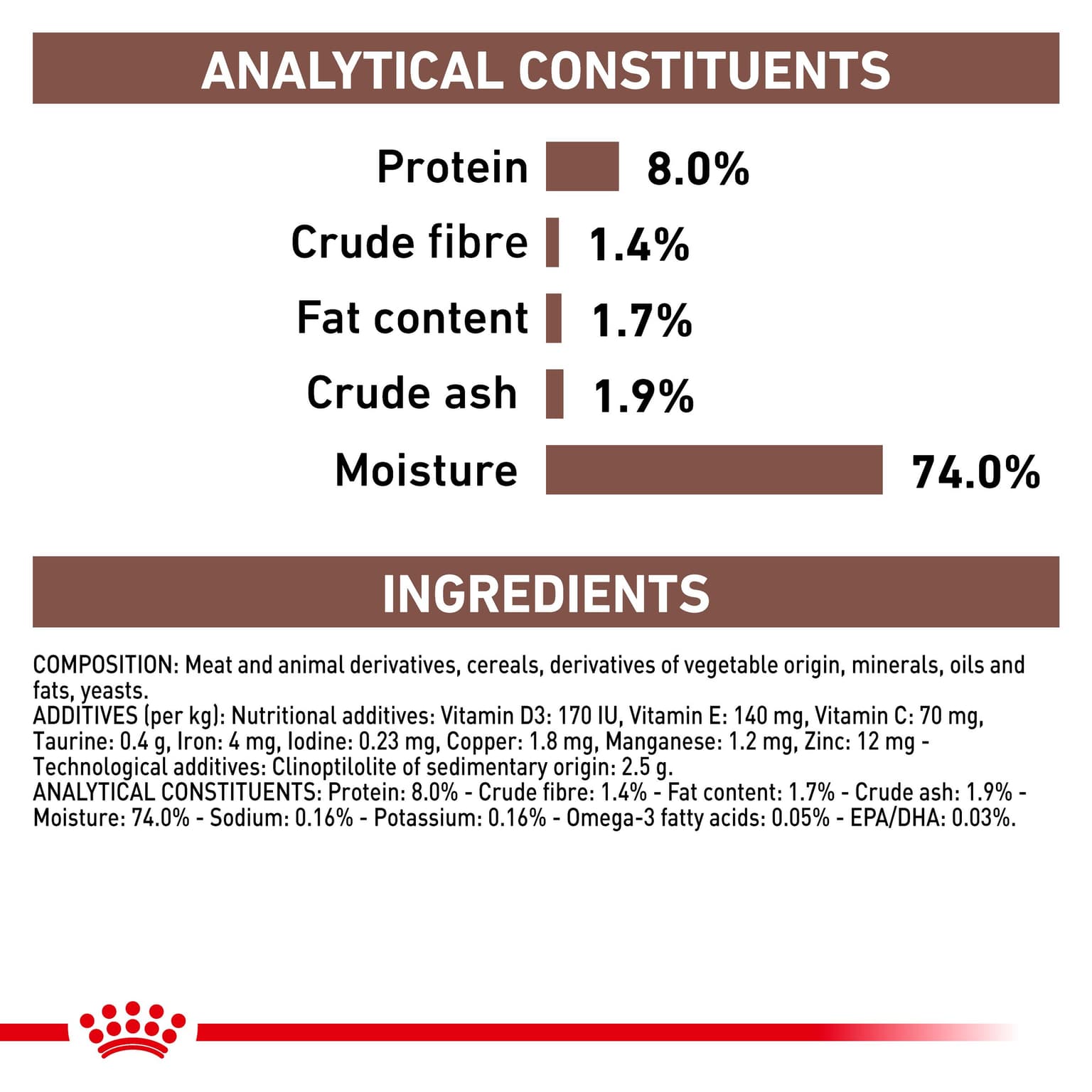 Composition: Pork by-products, rice flour, maize grits, maize flour, poultry byproducts, pork blood products, powdered cellulose, minerals, beet pulp, yeasts and part thereof, fish oil, marigold extract (source of lutein) Additives (per kg): Nutritional additives: Vitamin D3: 170 IU, Vitamin E: 140 mg, Vitamin C: 70 mg, Taurine: 0.4 g, Iron: 4 mg, Iodine: 0.23 mg, Copper: 1.8 mg, Manganese: 1.2 mg, Zinc: 12 mg - Technological additives: Clinoptilolite of sedimentary origin: 2.5 g. Analytical constituents: Protein 8.10% (min.), Fat 1.70% (min.), Calcium 0.20% (min.), Phosphorus 0.16% (min.), Crude Fiber 1.50% (max.), Dietary fibre: 2.80%(max.), NFE: 13.40%, Omega 6: 0.40%, Omega 3: 0.04%. Metabolisable energy: 94.0 kcal / 100g Please Note: Royal Canin takes pride in ensuring the scientific reliability of all product information. The information in this product listing was true and accurate at the time of publication. However, please note that from time to time, for example due to ingredient availability or a change in sourcing factory within our global factory network for the purpose of ongoing supply, it is necessary to make product changes at short notice, and there may be some delays in updating the information in our product materials.