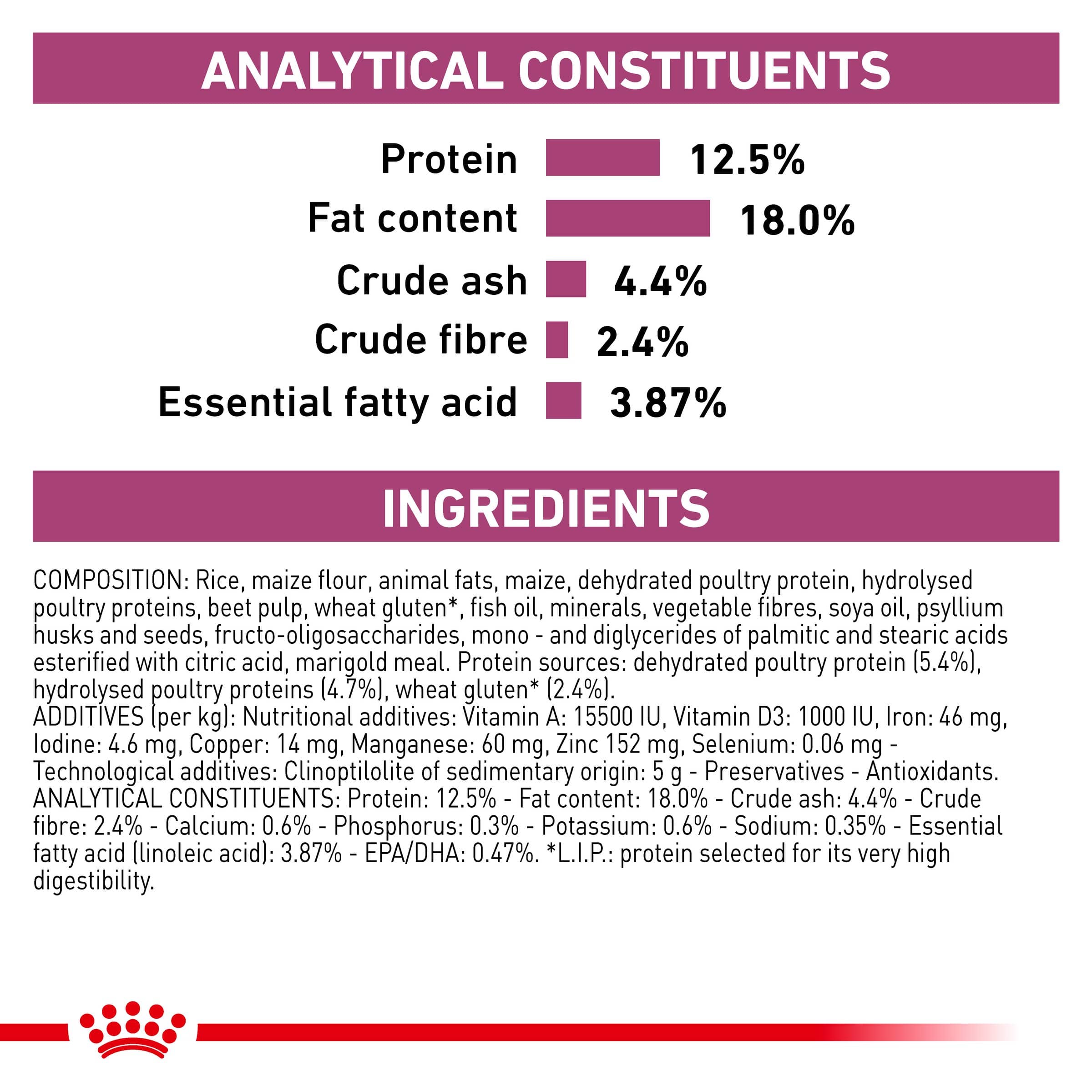 Composition: Rice, maize flour, animal fats, maize, dehydrated poultry protein, hydrolysed poultry proteins, beet pulp, wheat gluten**, fish oil, minerals, vegetable fibres, soya oil, psyllium husks and seeds, fructo-oligosaccharides, mono - and diglycerides of palmitic and stearic acids esterified with citric acid, marigold meal. Protein sources: dehydrated poultry protein (5.4%), hydrolysed poultry proteins (4.7%), wheat gluten** (2.4%). ** L.I.P.: protein selected for its very high digestibility Additives (per kg): Nutritional additives: Vitamin A: 15500 IU, Vitamin D3: 1000 IU, Iron: 46 mg, Iodine: 4.6 mg, Copper: 14 mg, Manganese: 60 mg, Zinc: 152 mg, Selenium: 0.06 mg - Technological additives: clinoptilolite of sedimentary origin: 5 g - Preservatives - Antioxidants Analytical constituents: Protein: 12.5% - Fat content: 18.0% - Crude ash: 4.4% - Crude fibre: 2.4% - Calcium: 0.6% - Phosphorus: 0.3% - Potassium: 0.6% - Sodium: 0.35% - Essential fatty acid (linoleic acid): 3.87% - EPA/DHA: 0.47%. *L.I.P.: protein selected for its very high digestibility. Please Note: Royal Canin takes pride in ensuring the scientific reliability of all product information. The information in this product listing was true and accurate at the time of publication. However, please note that from time to time, for example due to ingredient availability or a change in sourcing factory within our global factory network for the purpose of ongoing supply, it is necessary to make product changes at short notice, and there may be some delays in updating the information in our product materials.