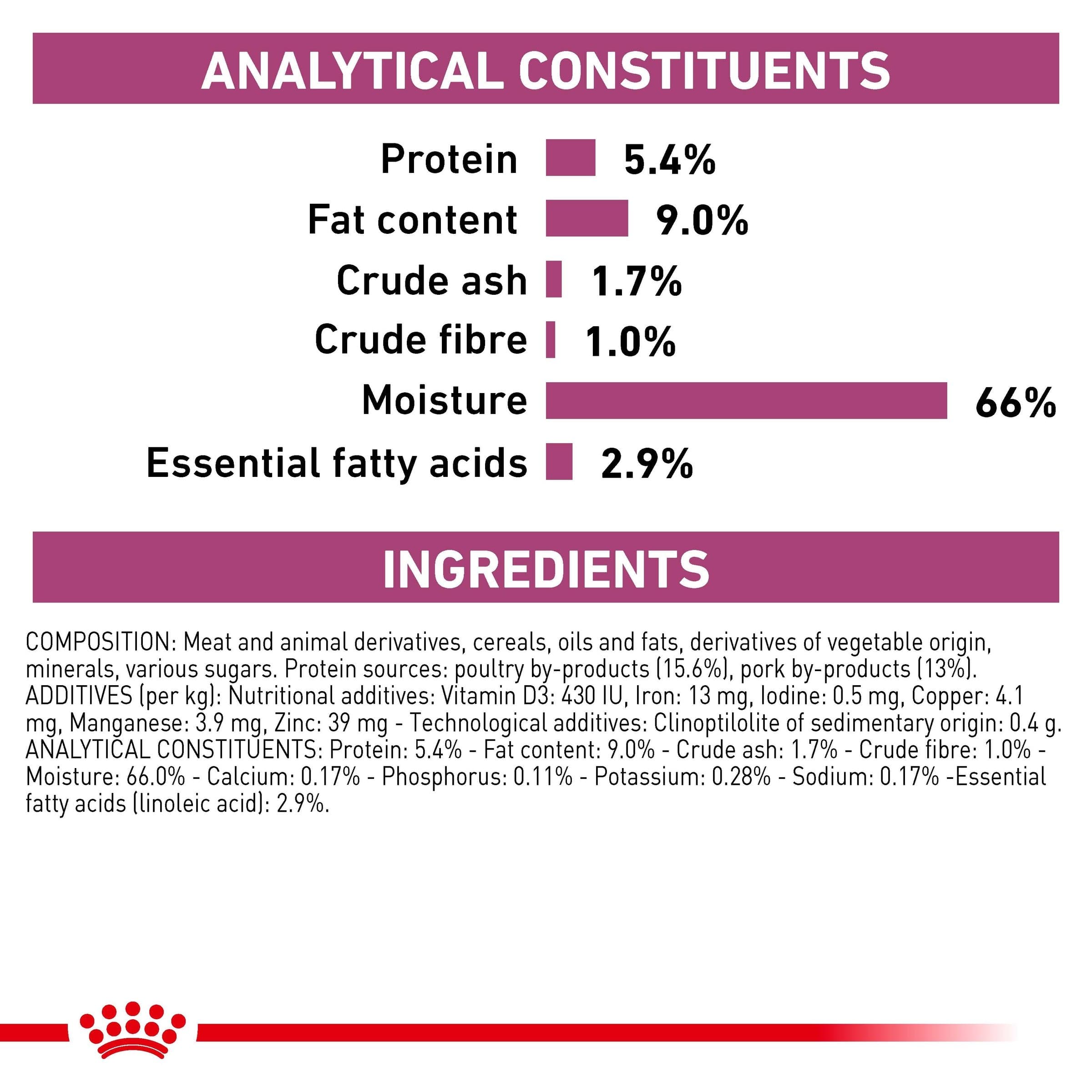 Composition: Poultry by-products, rice, pork by-products, maize flour, sunflower oil refined, minerals, rice flour, powder cellulose, fish oil, dried beet pulp, fructo-oligosaccharides, marigold meal. Protein sources: poultry by-products (15.6%), pork by-products (13%) Additives (per kg): Nutritional additives: Vitamin D3: 430 IU, Iron: 13 mg, Iodine: 0.5 mg, Copper: 4.1 mg, Manganese: 3.9 mg, Zinc: 39 mg - Technological additives: clinoptilolite of sedimentary origin: 0.4 g Analytical constituents: Protein: 5.4%, Fat content: 9.0%, Crude ash: 1.7%, Crude fibres: 1.0%, Moisture: 66.0%, Calcium: 0.17%, Phosphorus: 0.11%, Potassium: 0.28%, Sodium: 0.17%, Essential Fatty acid (Linoleic Acid): 2.9%. Metabolisable energy: 158.60 kcal/ 100g. Please Note: Royal Canin takes pride in ensuring the scientific reliability of all product information. The information in this product listing was true and accurate at the time of publication. However, please note that from time to time, for example due to ingredient availability or a change in sourcing factory within our global factory network for the purpose of ongoing supply, it is necessary to make product changes at short notice, and there may be some delays in updating the information in our product materials.