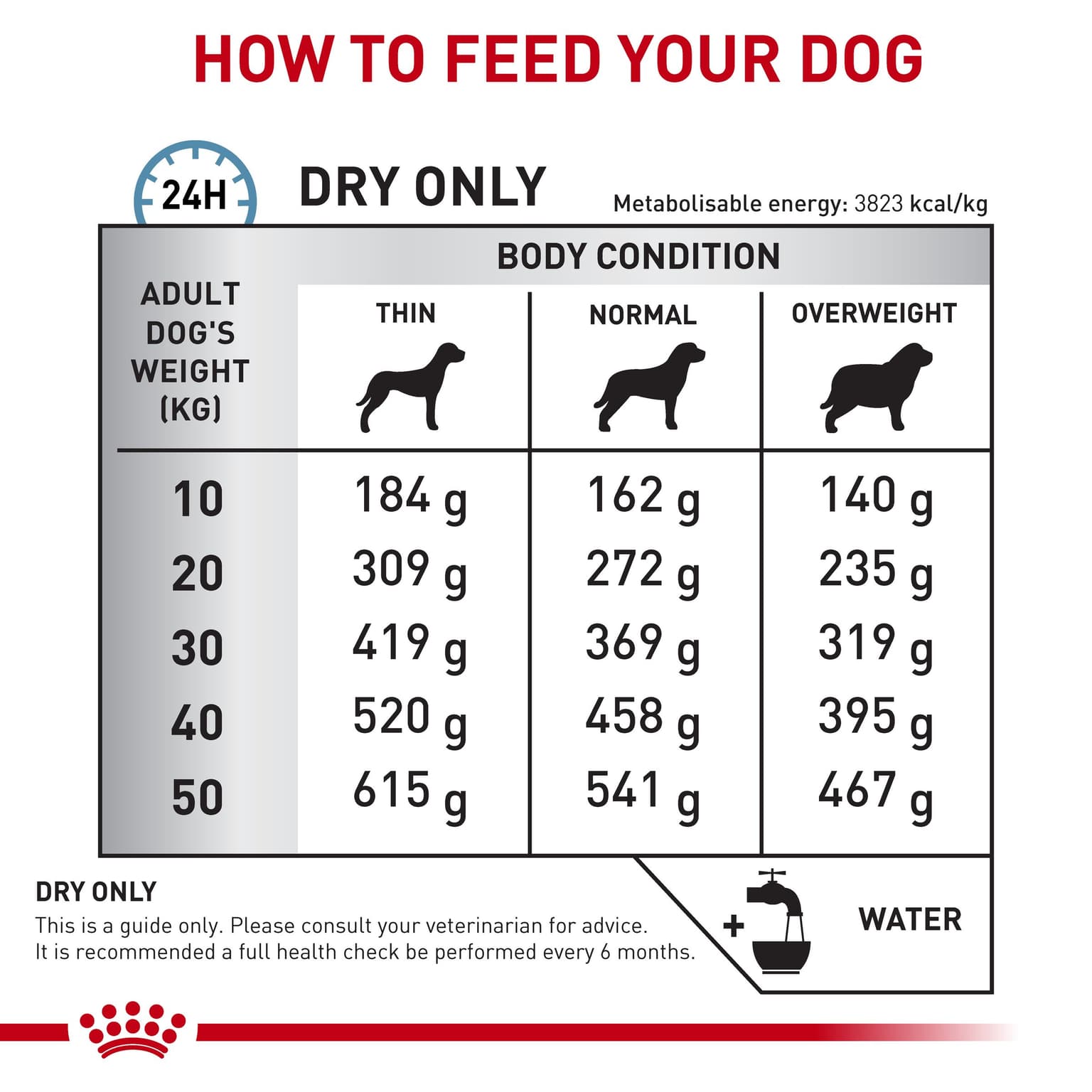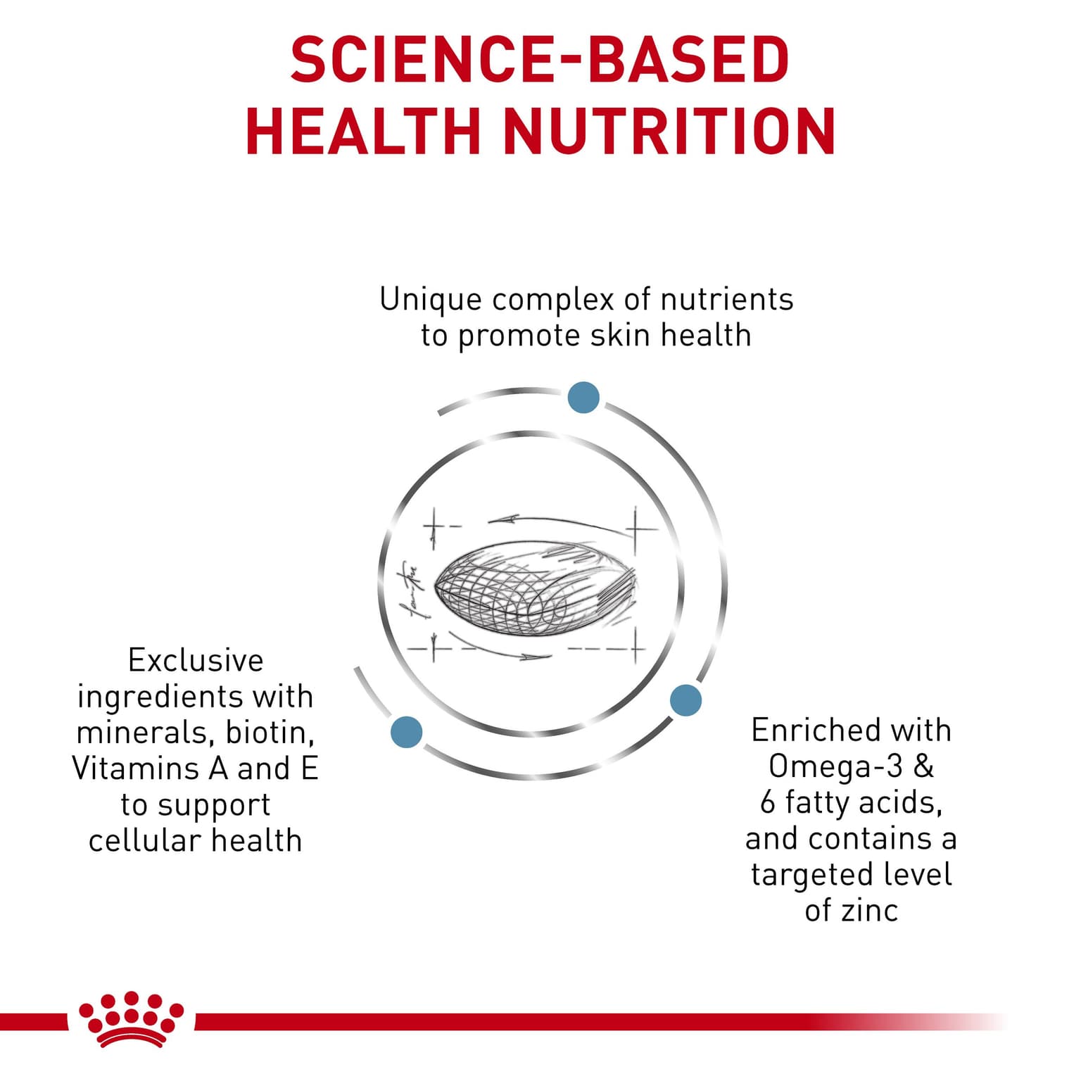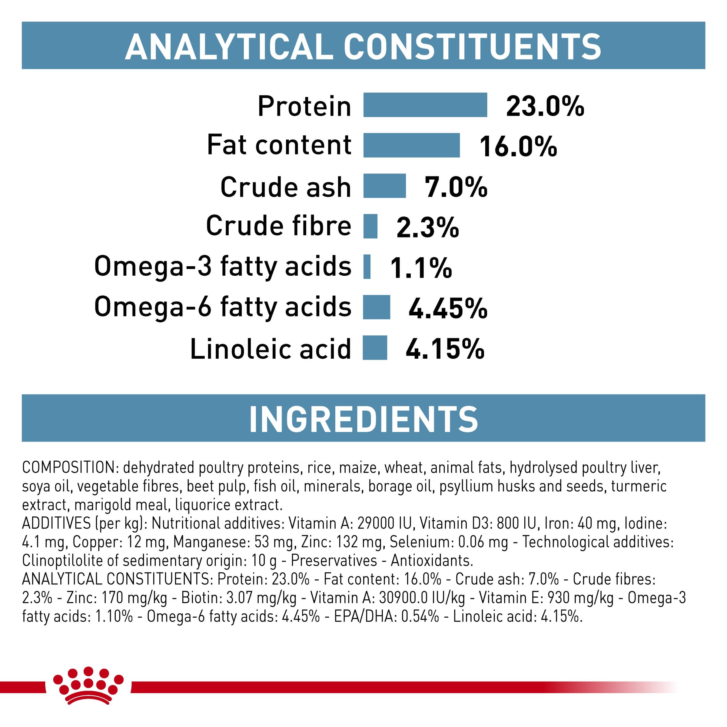 Composition: dehydrated poultry proteins, rice, maize, wheat, animal fats, hydrolysed poultry liver, soya oil, vegetable fibres, beet pulp, fish oil, minerals, borage oil, psyllium husks and seeds, turmeric extract, marigold meal, liquorice extract Additives (per kg): Nutritional additives: Vitamin A: 29000 IU, Vitamin D3: 800 IU, Iron: 40 mg, Iodine: 4.1 mg, Copper: 12 mg, Manganese: 53 mg, Zinc: 132 mg, Selenium: 0.06 mg - Technological additives: Clinoptilolite of sedimentary origin: 10 g - Preservatives - Antioxidants. Analytical constituents: Protein: 23.0% - Fat content: 16.0% - Crude ash: 7.0% - Crude fibres: 2.3% - Zinc: 170 mg/kg - Biotin: 3.07 mg/kg - Vitamin A: 30900.0 IU/kg - Vitamin E: 930 mg/kg - Omega-3 fatty acids: 1.10% - Omega-6 fatty acids: 4.45% - EPA/DHA: 0.54% - Linoleic acid: 4.15%. Please Note: Royal Canin takes pride in ensuring the scientific reliability of all product information. The information in this product listing was true and accurate at the time of publication. However, please note that from time to time, for example due to ingredient availability or a change in sourcing factory within our global factory network for the purpose of ongoing supply, it is necessary to make product changes at short notice, and there may be some delays in updating the information in our product materials.