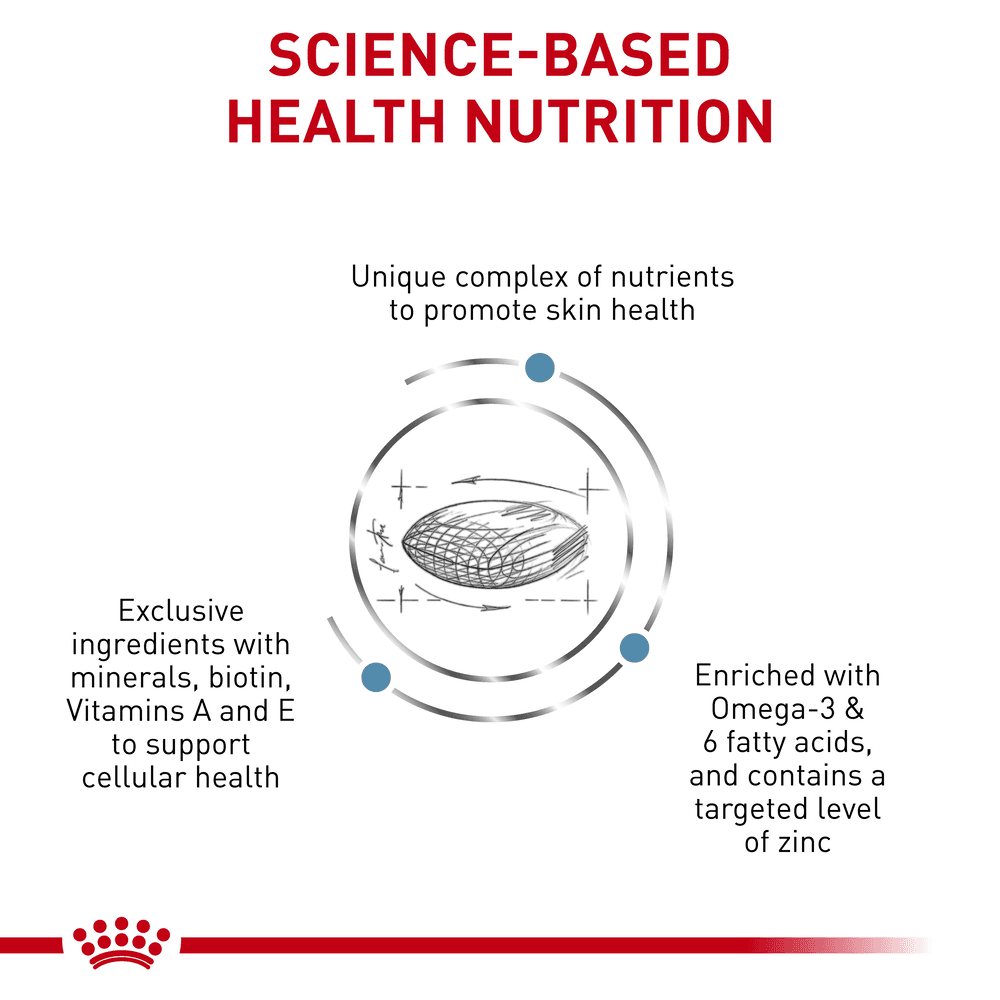 Dehydrated poultry proteins, rice, maize, wheat, animal fats, hydrolysed poultry liver, soya oil, vegetable fibres, beet pulp, fish oil, minerals, borage oil, psyllium husks and seeds, turmeric extract, marigold meal, licorice extract. _________________________________________________________________________________ Additives (KG)**: Nutritional additives: Vitamin A: 29000 IU, Vitamin D3: 800 IU, Iron: 40 mg, Iodine: 4.1 mg, Copper: 12 mg, Manganese: 53 mg, Zinc: 132 mg, Selenium: 0.06 mg. Technological additives: Clinoptilolite of sedimentary origin: 10 g. Preservatives. Antioxidants. ** NOTE: Values reflect only levels added to the formula, not those naturally occurring in components of the diet. _________________________________________________________________________________ Please Note: Royal Canin takes pride in ensuring the scientific reliability of all product information. The information in this product listing was true and accurate at the time of publication. However, please note that from time to time, for example due to ingredient availability or a change in sourcing factory within our global factory network for the purpose of ongoing supply, it is necessary to make product changes at short notice, and there may be some delays in updating the information in our product materials.