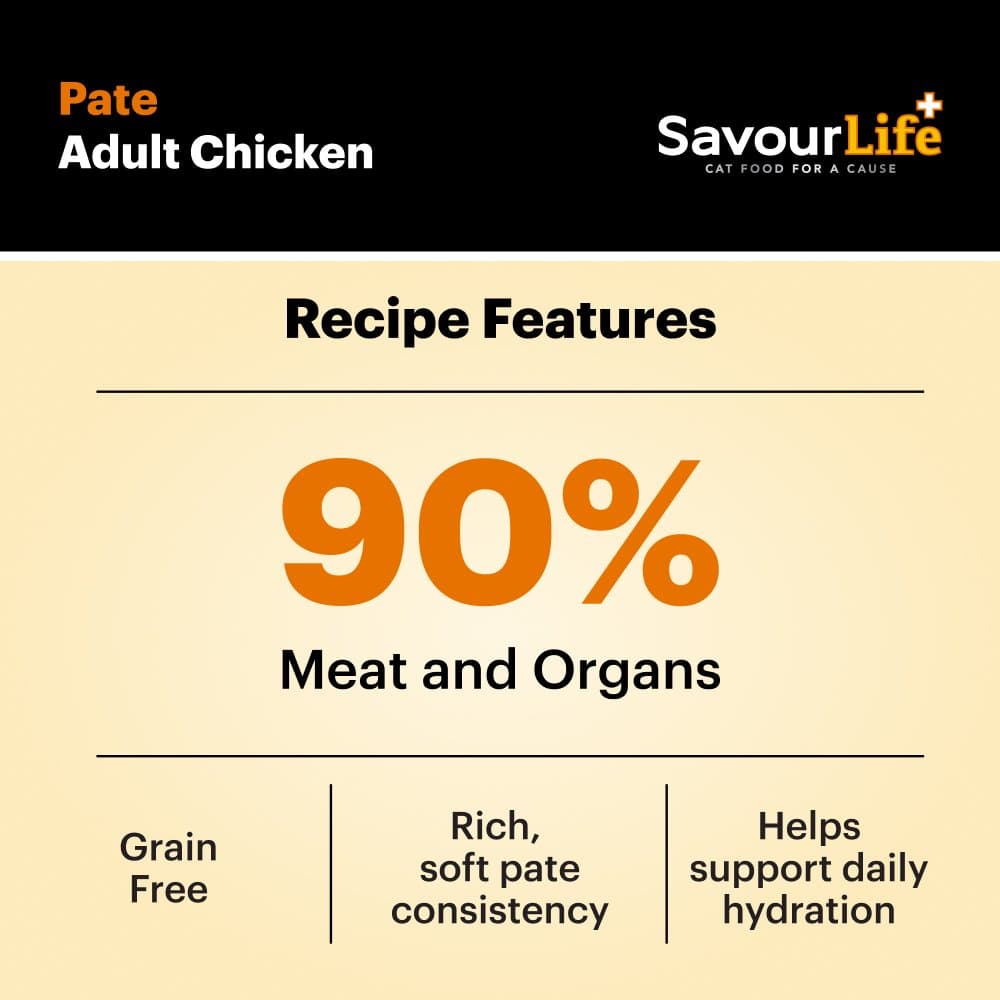 SavourLife Chicken Adult Wet Cat Food is a premium, meat-rich meal designed to provide adult cats with high-quality nutrition and exceptional flavour. This grain-free recipe is crafted with 90% meat and organs to support the natural dietary needs of feline companions while contributing to life-saving animal rescue efforts.