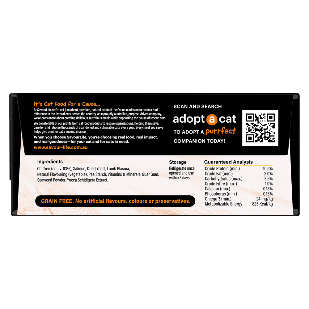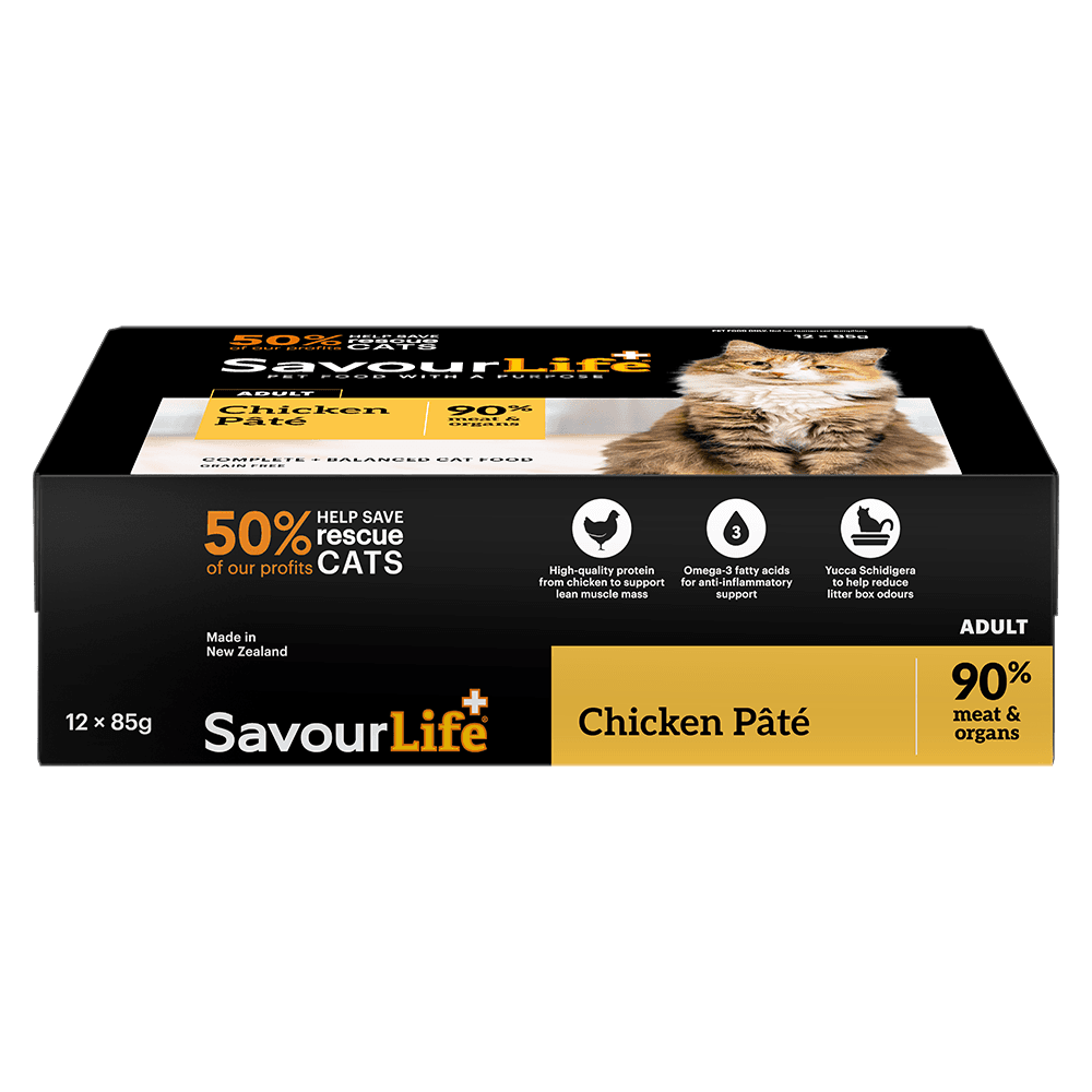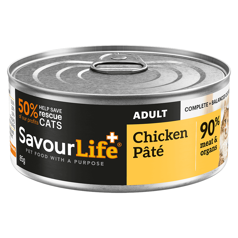 SavourLife Chicken Adult Wet Cat Food is a premium, meat-rich meal designed to provide adult cats with high-quality nutrition and exceptional flavour. This grain-free recipe is crafted with 90% meat and organs to support the natural dietary needs of feline companions while contributing to life-saving animal rescue efforts.