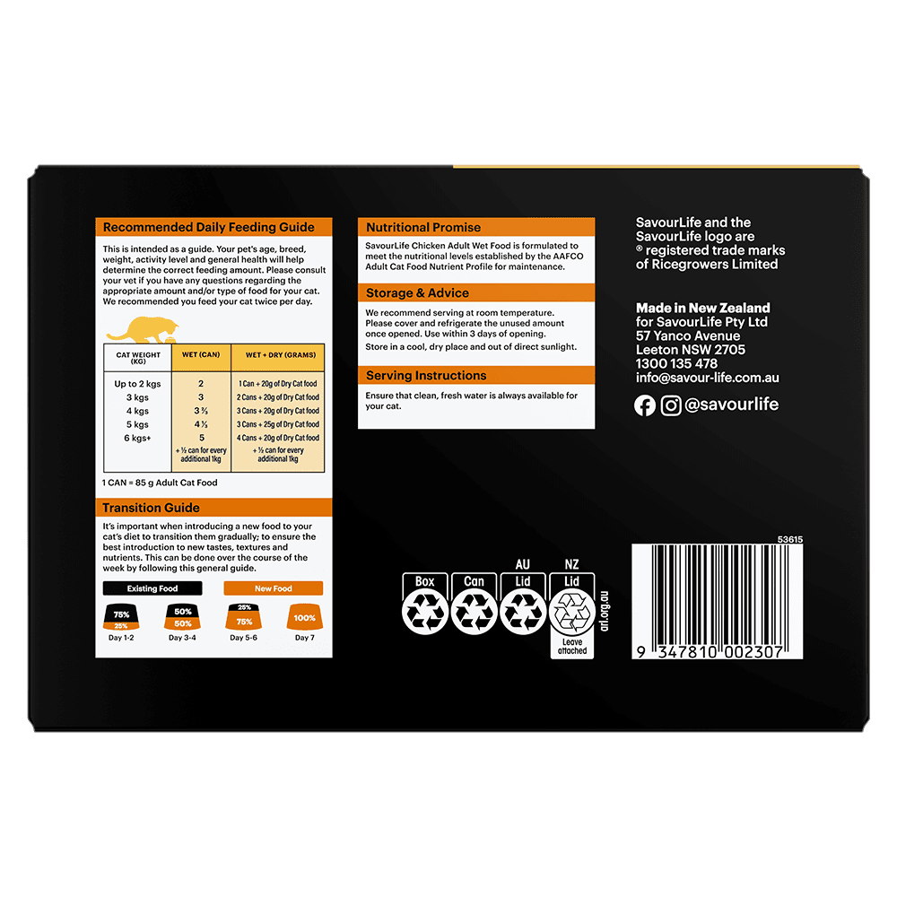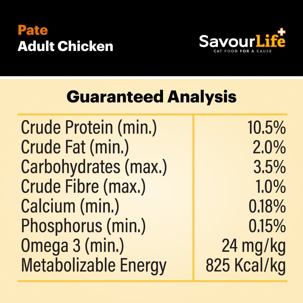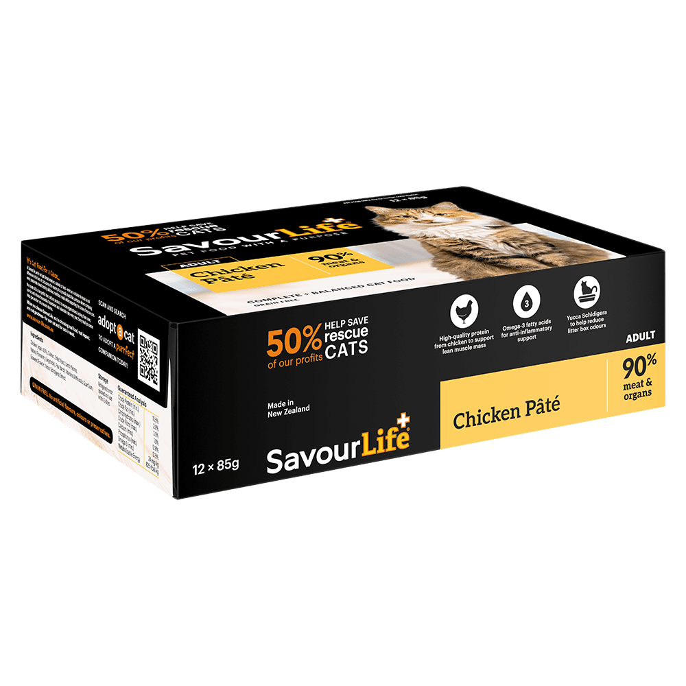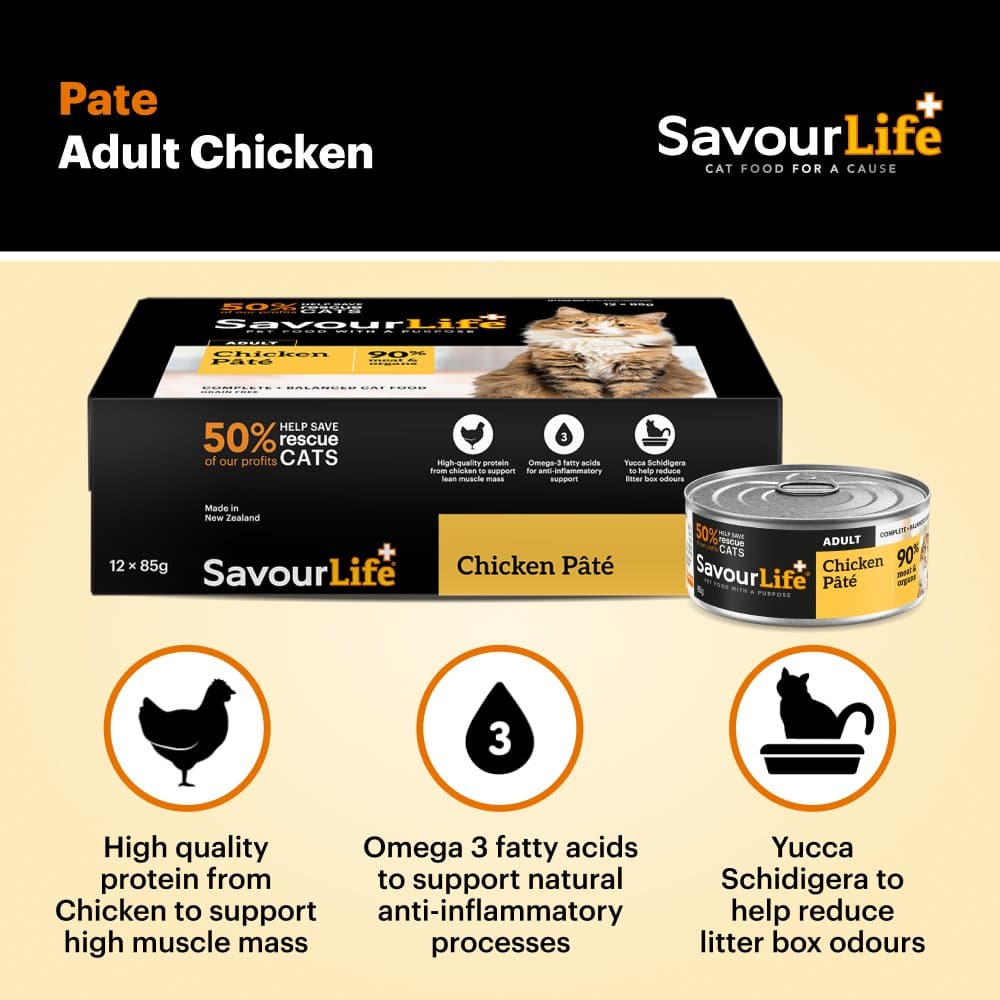 SavourLife Chicken Adult Wet Cat Food is a premium, meat-rich meal designed to provide adult cats with high-quality nutrition and exceptional flavour. This grain-free recipe is crafted with 90% meat and organs to support the natural dietary needs of feline companions while contributing to life-saving animal rescue efforts.