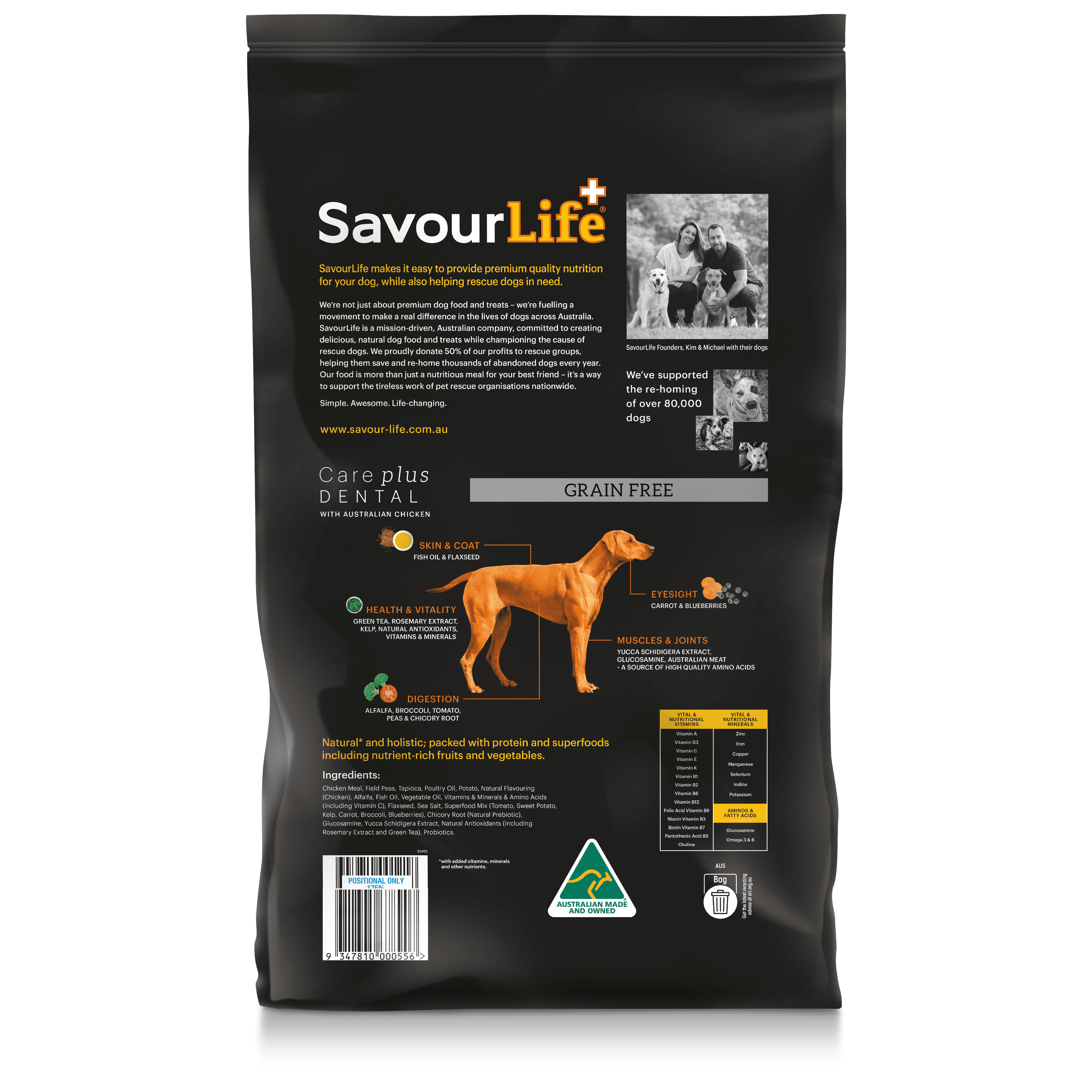 Chicken Meal, Field Peas, Tapioca, Poultry Oil, Potato, Natural Flavouring, Alfalfa, Fish Oil, Vitamins & Minerals & Amino Acids, Flaxseed, Sea Salt, Superfood Mix (Tomato, Sweet Potato, Kelp, Carrot, Broccoli, Blueberries), Yucca Schidigera Extract, Chicory Root (Natural Prebiotic), Glucosamine, Natural Antioxidants (including Rosemary Extract and Green Tea), Probiotics
