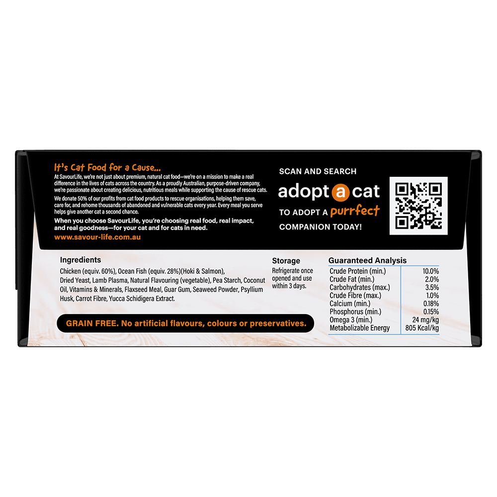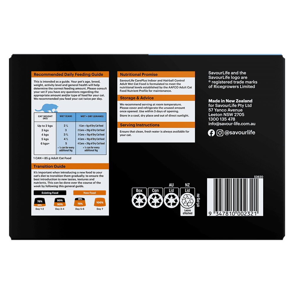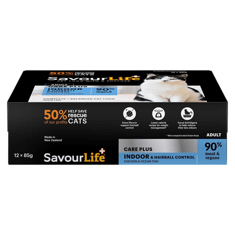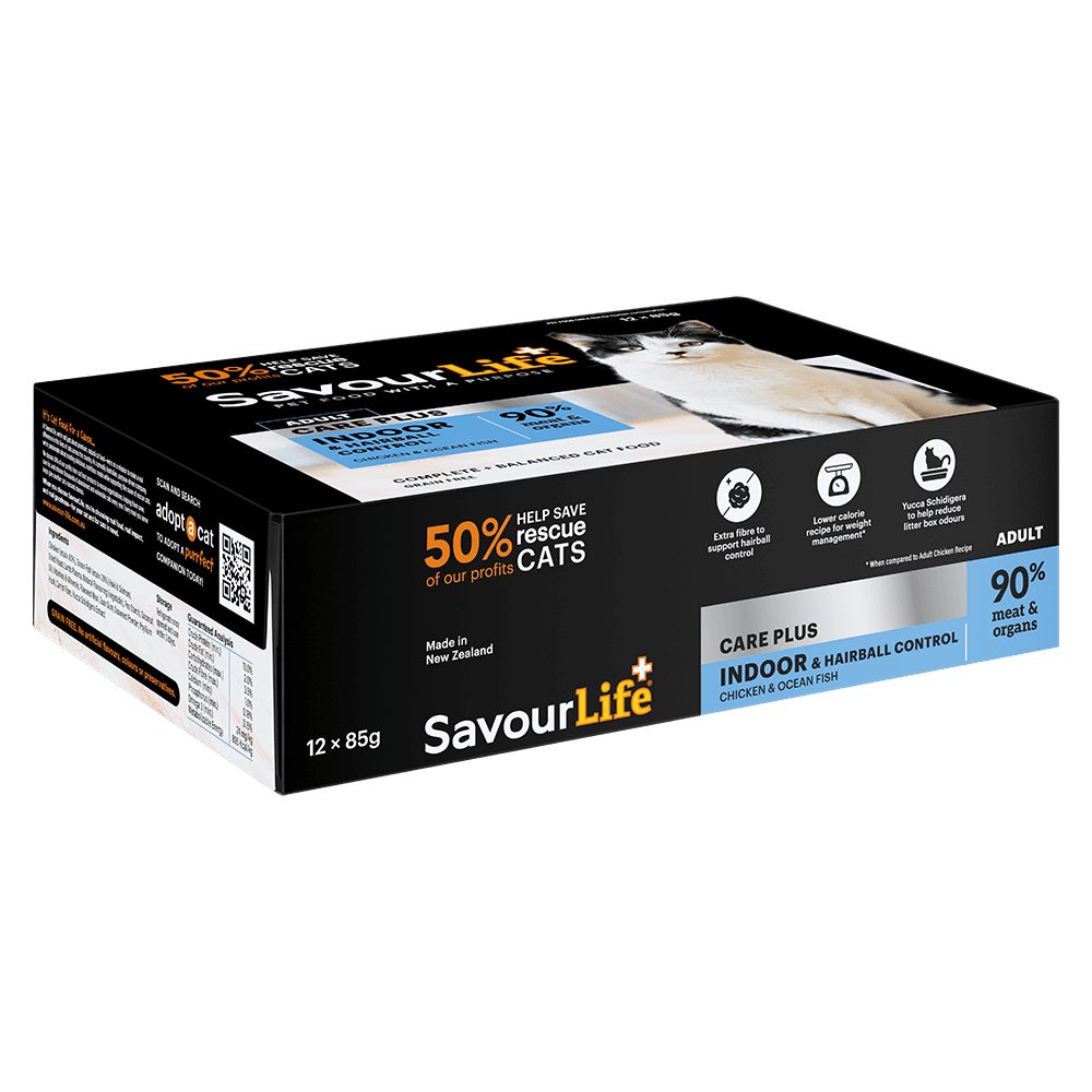 The Savourlife Indoor And Hairball Control Chicken Ocean Fish Adult Wet Cat Food is a premium, grain-free complete and balanced meal designed specifically to support the health and wellbeing of indoor and less active adult cats. This highly palatable wet food is made with 90% meat and organs, featuring a blend of quality chicken, ocean fish (hoki and salmon), and is enriched with a targeted hairball control formula.