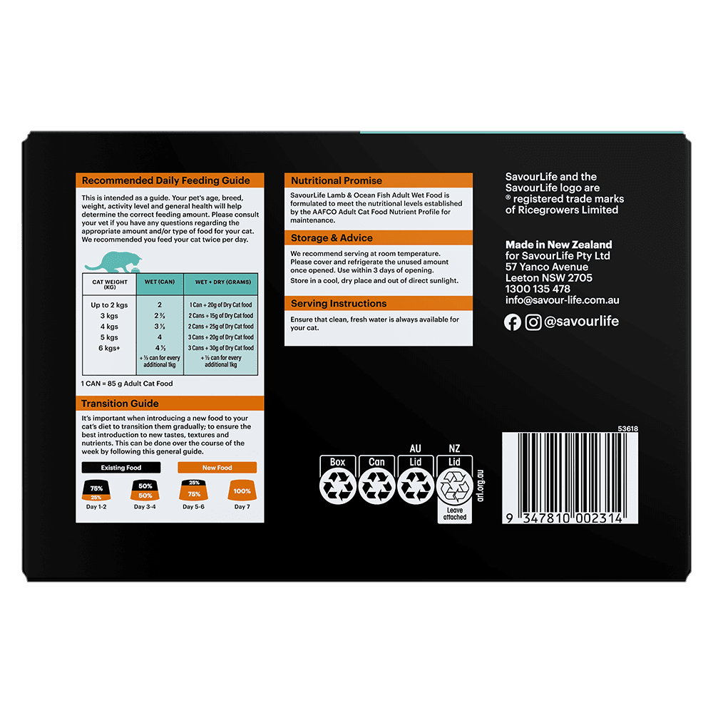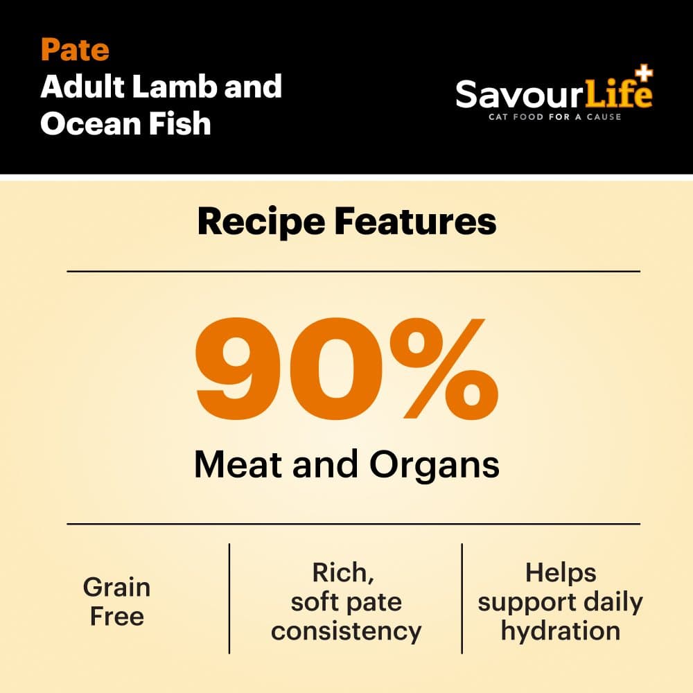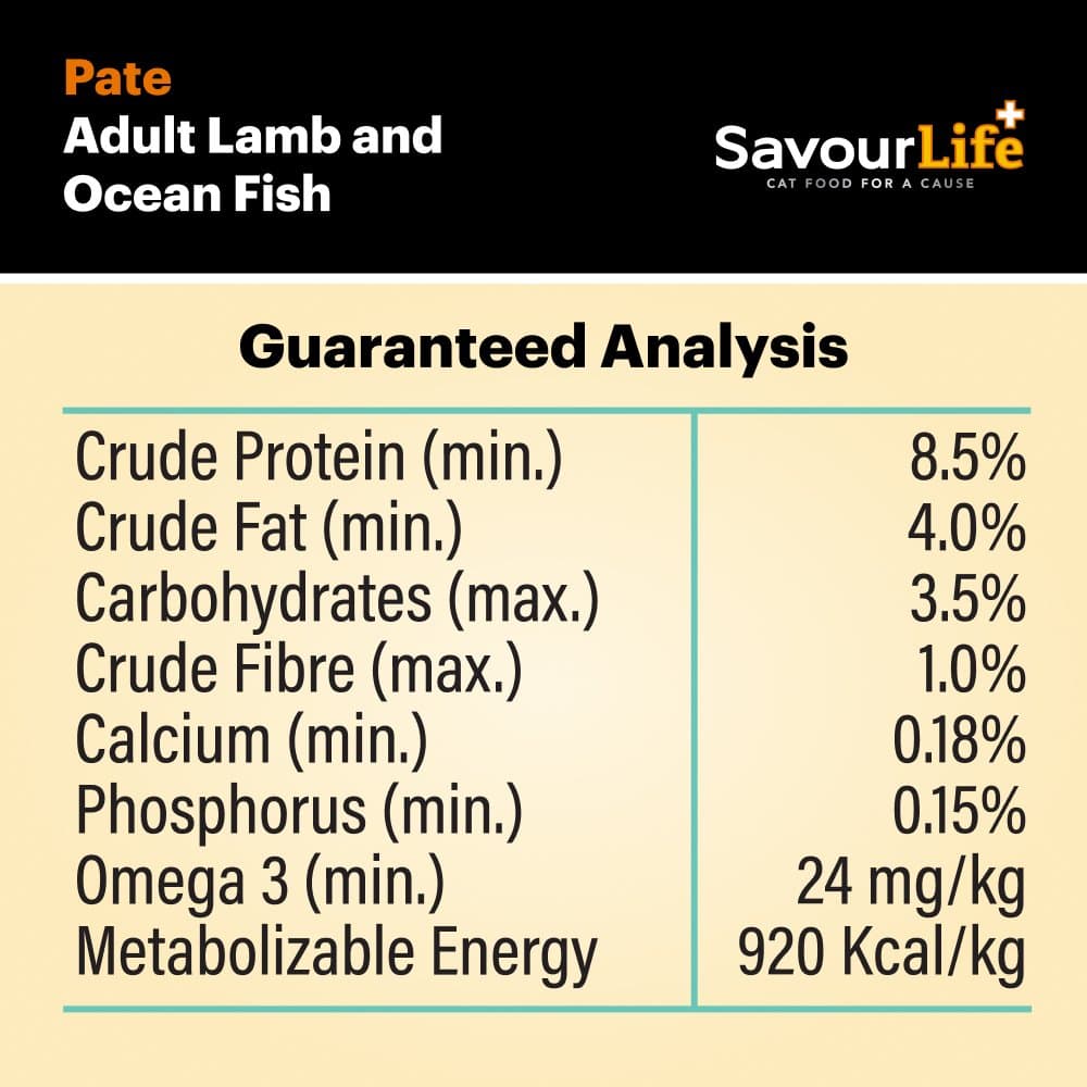 - Every can of SavourLife Lamb And Ocean Fish Adult Wet Cat Food is fortified with essential vitamins, minerals, and natural seaweed powder to deliver comprehensive nutrition