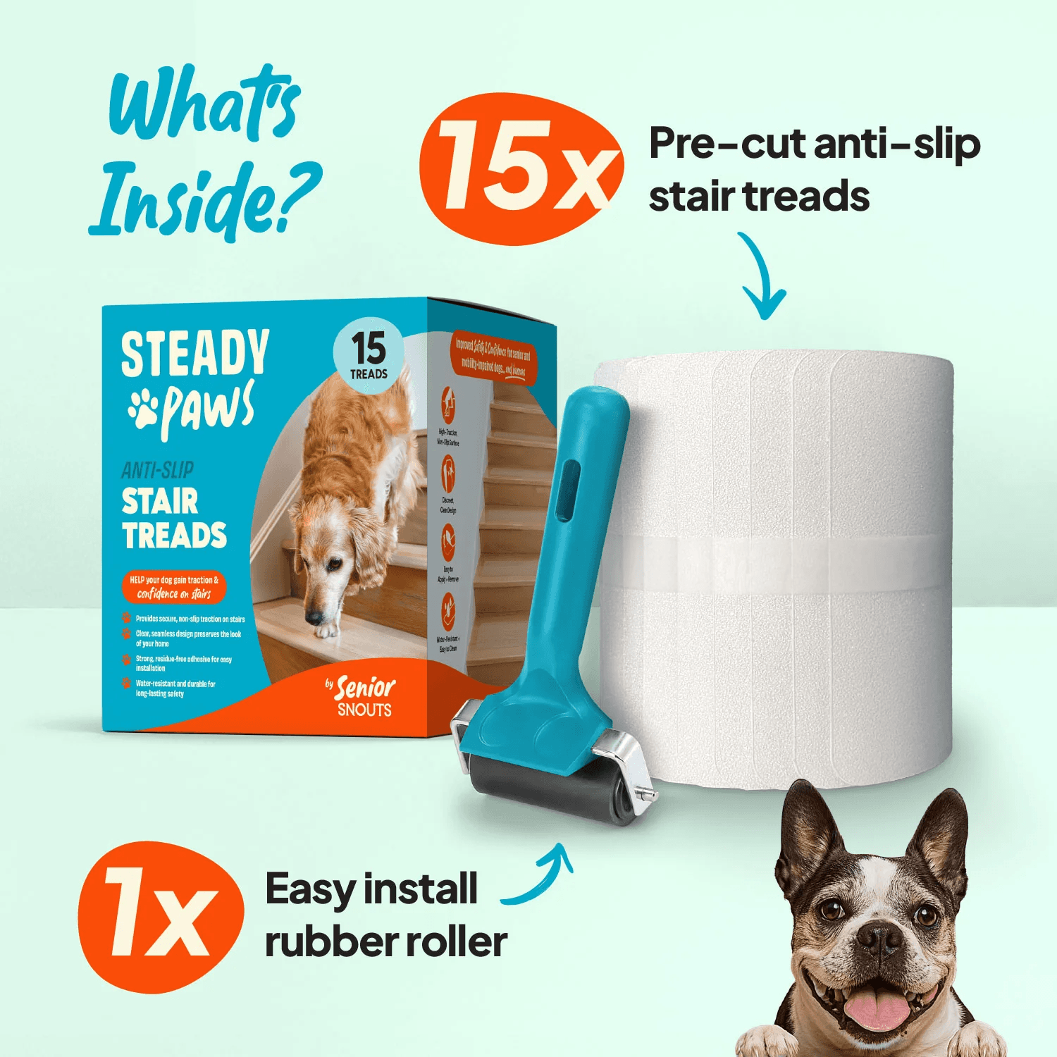 - Provides excellent grip to prevent slips and boost your dog's confidence on stairs