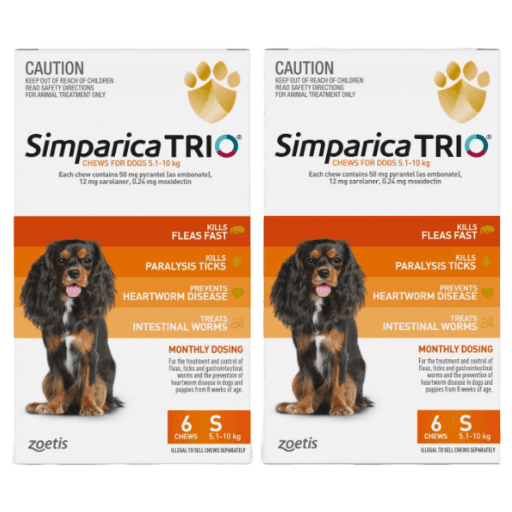 Simparica Trio is the all-in-one protector against pests and parasites, crafted for small dogs weighing between 5.1 and 10.0kg. This monthly liver-flavoured chew shields your furry mate from fleas, ticks, heartworm, and intestinal worms, with added consideration for tapeworms and mites.