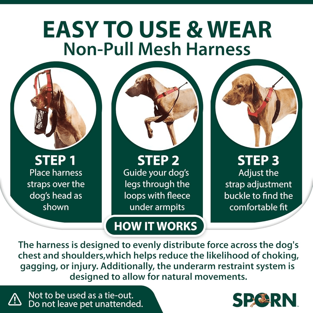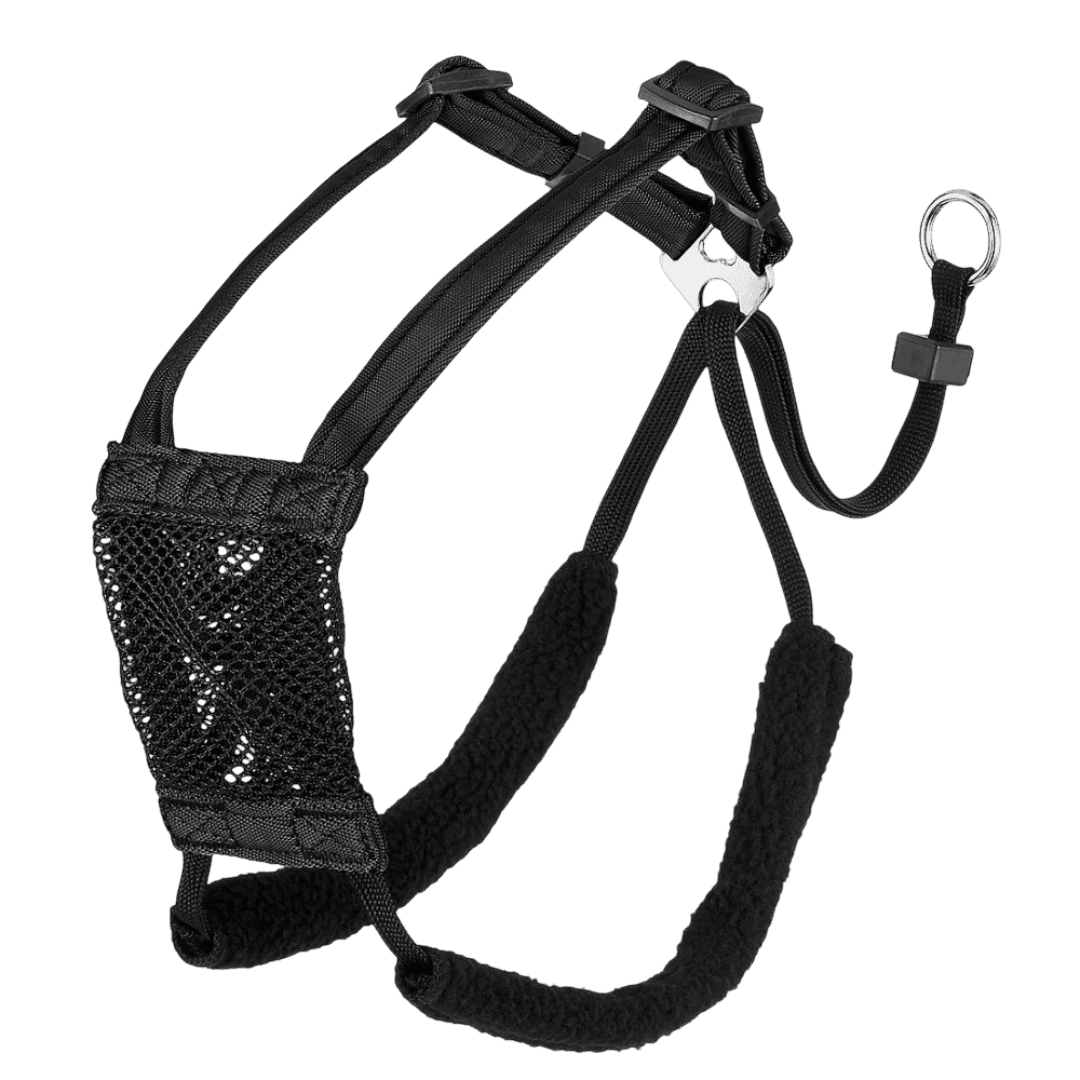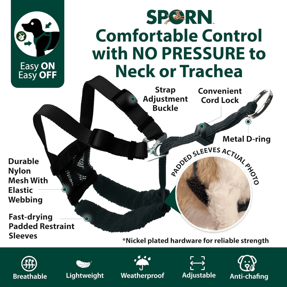 The Sporn Stop Pull Mesh Dog Harness in Black helps turn tug-of-war into a calmer walk. The patented design guides from the chest and underarms to discourage pulling, while the breathable mesh plate and fleece-lined sleeves keep things comfortable. It slips on fast, adjusts with a sliding cord lock, and uses weather-resistant nylon with nickel-plated hardware for everyday reliability.
