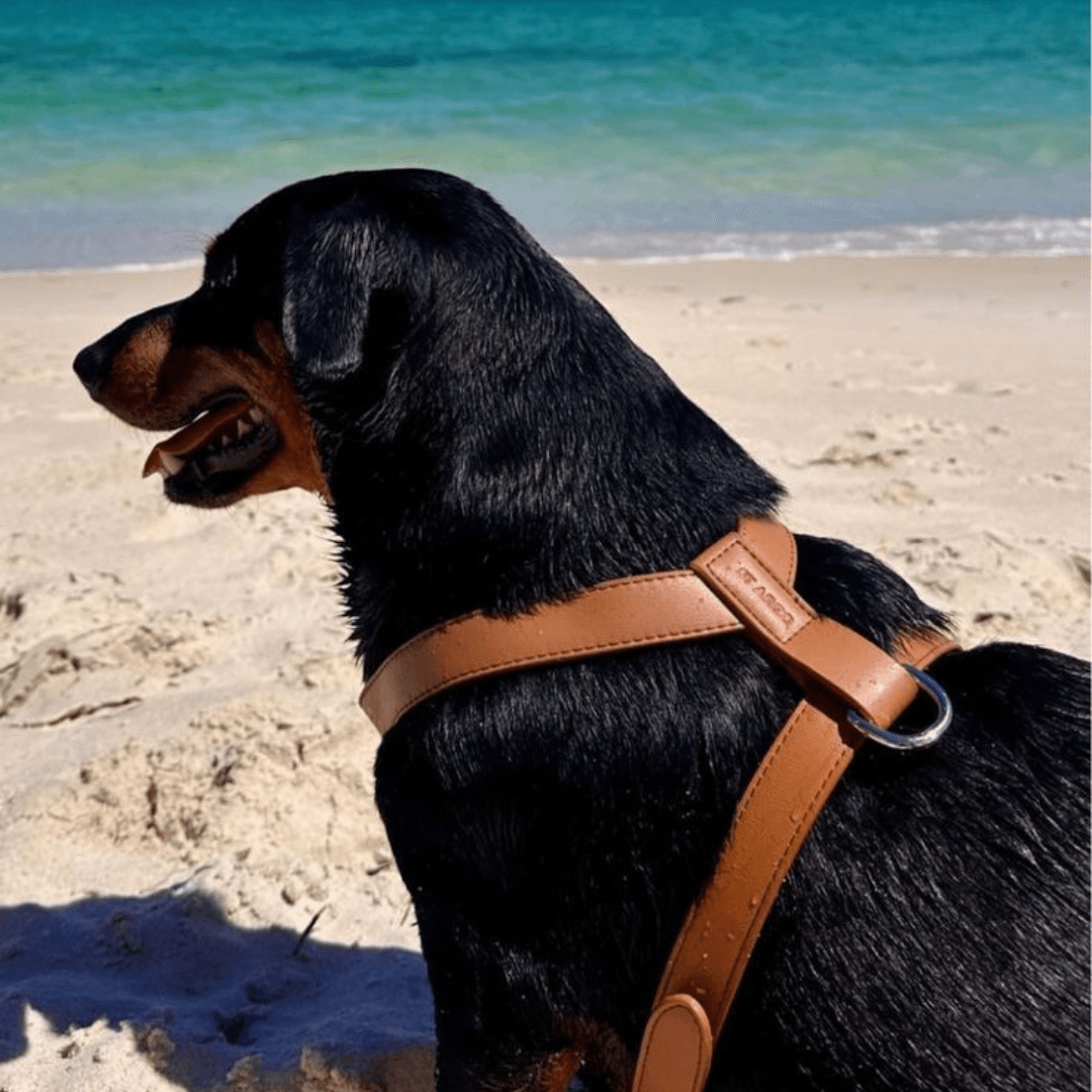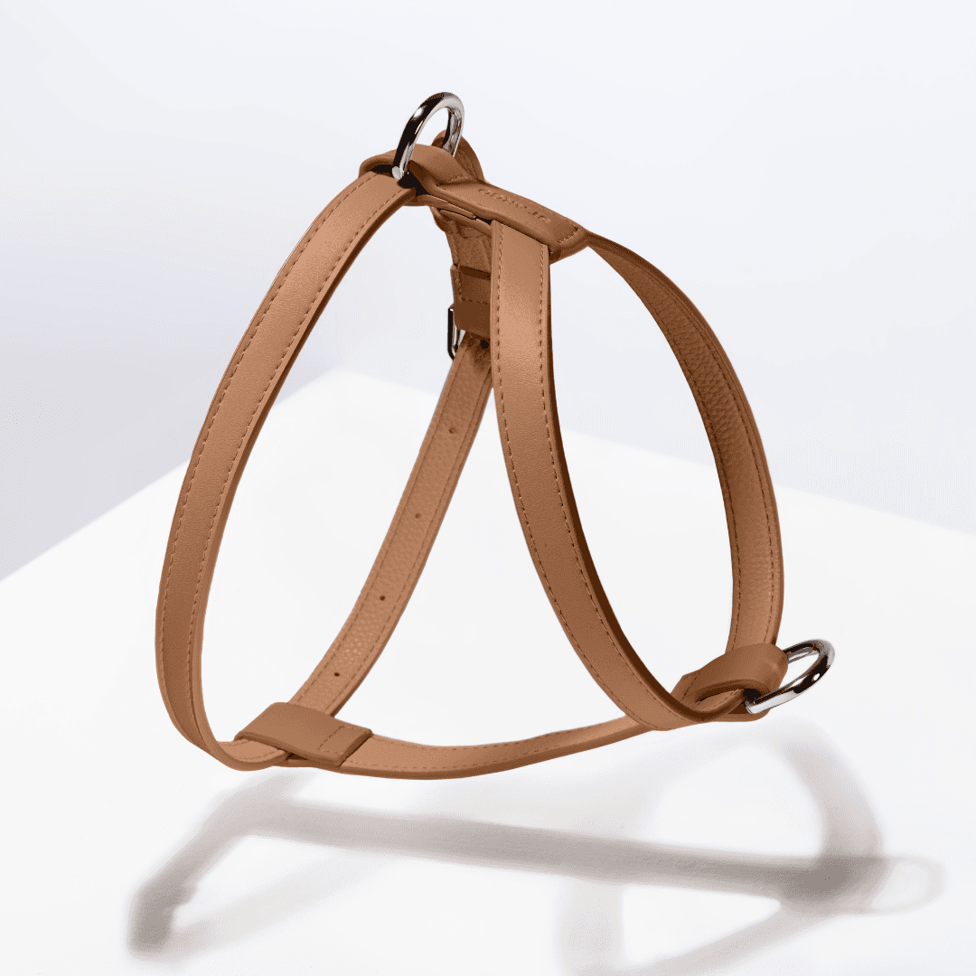 The Vegan Leather Dog Harness in Brown combines elegance with everyday ease, featuring buttery-soft PU vegan leather, reinforced mesh, and top-quality silver hardware. This milk chocolate-toned harness offers a no-pull design with a generous neck strap and adjustable chest fit for a smooth and secure walk.