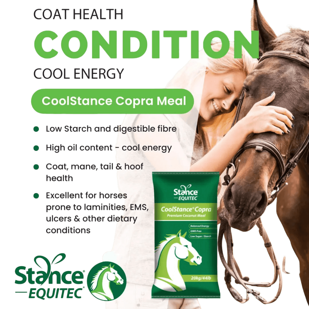 Introducing Stance Equitec CoolStance® Premium Coconut (Copra) Meal, the world's only low NSC, high-energy, GMO-free feed that's safe for insulin-resistant and laminitis-prone horses, and even those with anhidrosis! Made from the finest white part of the coconut, this truly natural and chemical-free product delivers 'cool' energy from coconut oil and fibre, supporting a natural state of gut health and normal insulin metabolism for your equine companion.