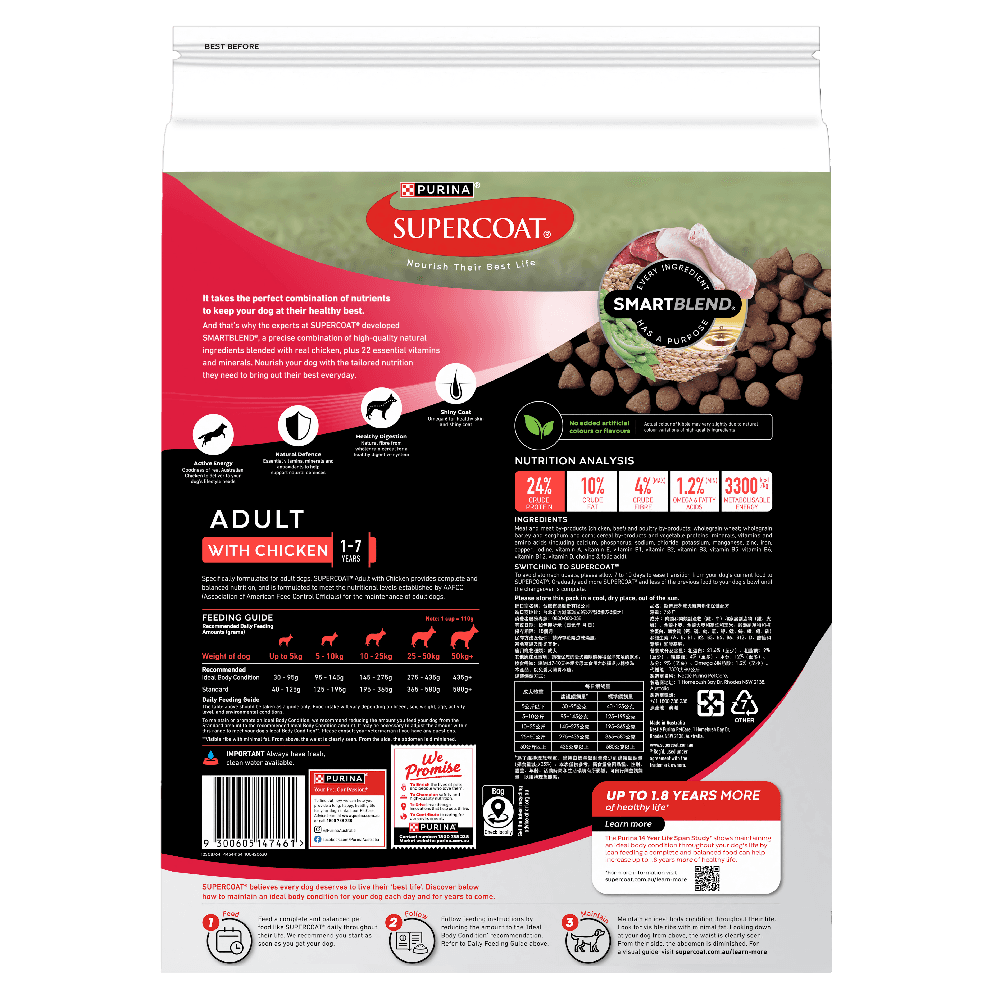 Meat And Meat By-Products (Chicken, Beef, Lamb And/Or Pork) And Or Poultry By-Products, Wholegrain Wheat, Wholegrain Barley And/Or Corn And/Or Sorghum, Cereal By-Products And/Or Vegetable Proteins, Mineral (Calcium Carbonate, Potassium Chloride, Phosphoric Acid, Sodium Chloride, Copper, Iodine, Iron, Manganese, Magnesium, Selenium, Zinc), Beet Pulp, Vitamins (A, B1, B2, B3, B5, B6, B9, B12, D3, E And Choline), Garlic, Rosemary Plant Extract (Natural Antioxidants).