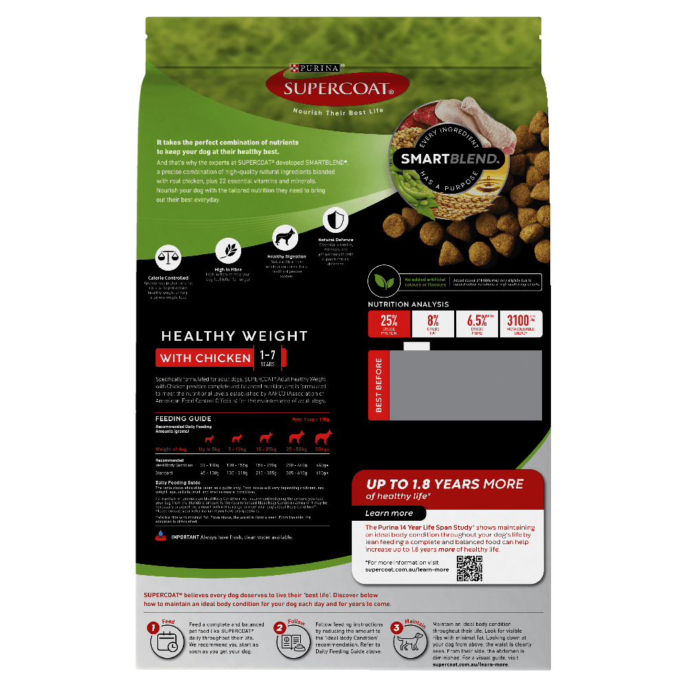 Supercoat Smartblend Healthy Weight Chicken Adult Dry Dog Food is specially formulated for adult dogs who may be less active or prone to weight gain by providing a calorie-controlled diet enriched with real chicken and natural fibers without artificial colours or flavours.