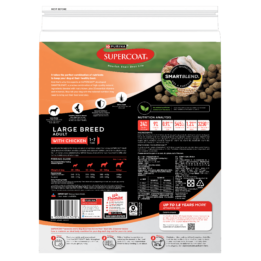 Meat and meat by-products (chicken, beef, lamb and/or pork) and or Poultry by-products, Wholegrain Wheat, Wholegrain Barley and/or Corn and/or Sorghum, Cereal by-products and/or Vegetable Proteins, Minerals (Calcium Carbonate, Potassium Chloride, Phosphoric Acid, Sodium Chloride, Copper, Iodine, Iron, Manganese, Magnesium, Selenium, Zinc), Beet pulp, Vitamins (A, B1, B2, B3, B5, B6, B9, B12, D3, E and Choline), Garlic, rosemary plant extract (Natural Antioxidants).
