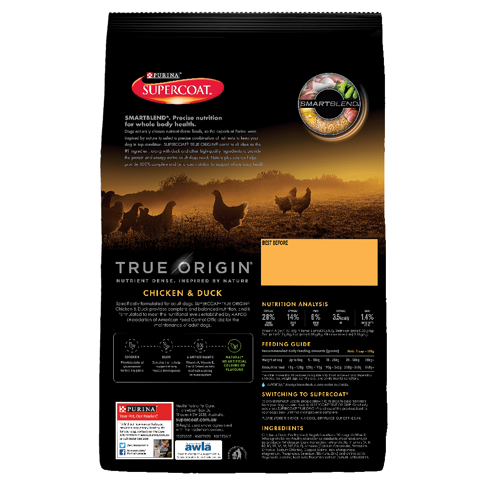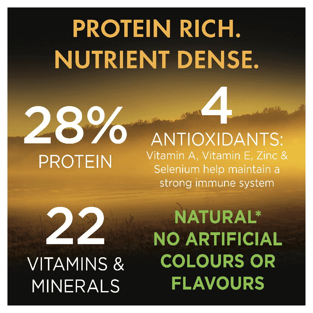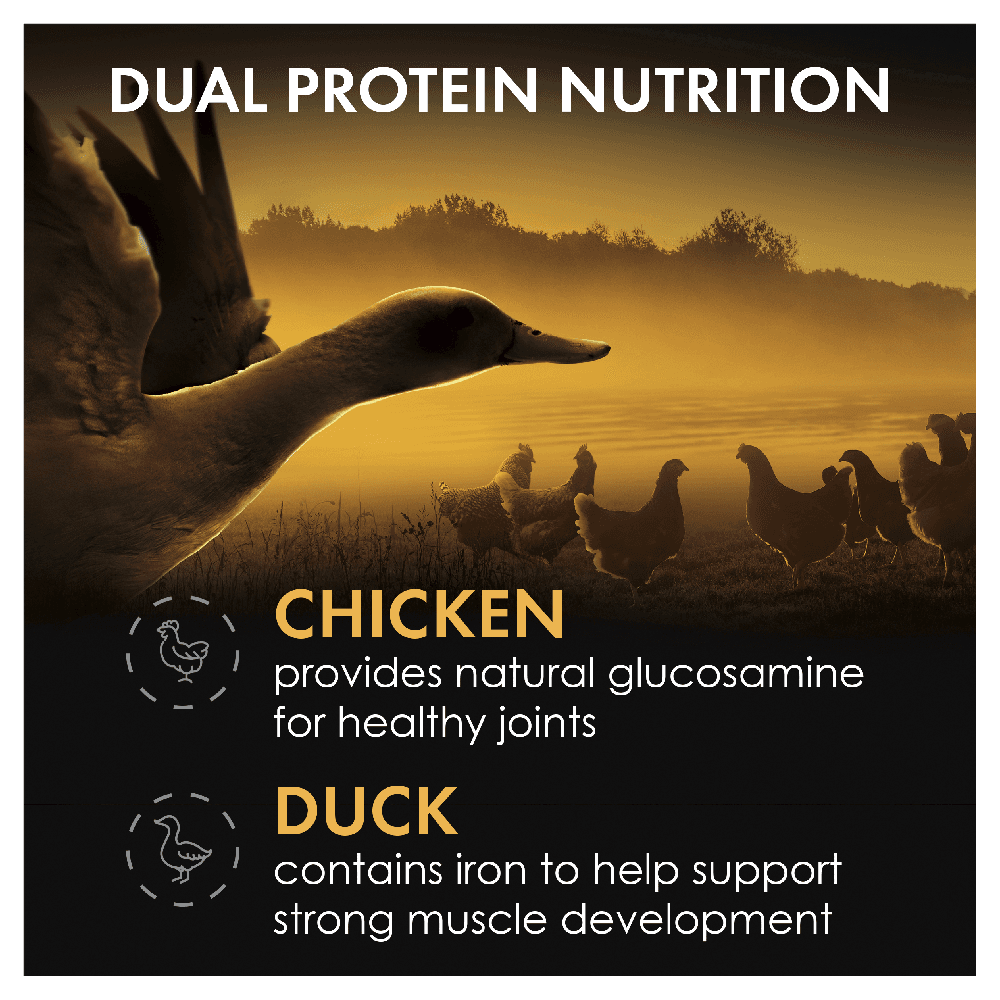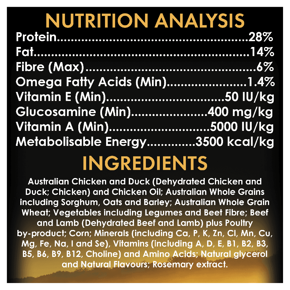 Chicken & Duck; Poultry Meal; Vegetable Meals; Wholegrain Wheat; Wholegrain Barley; Poultry oil and/or by-products; Meat meal and/or by-products; Wholegrain Corn; Humectant; Mineral salts; Vitamins (A, B1, B2, B3, B5, B6, B9, B12, D3, E), Minerals (Calcium Carbonate, Potassium Chloride, Sodium Chloride, Copper, Iodine, Iron, Manganese, Magnesium, Phosphorus, Selenium, Titanium, Zinc) and amino acids; Vegetable proteins; Beet pulp; Rosemary extract (natural antioxidant).