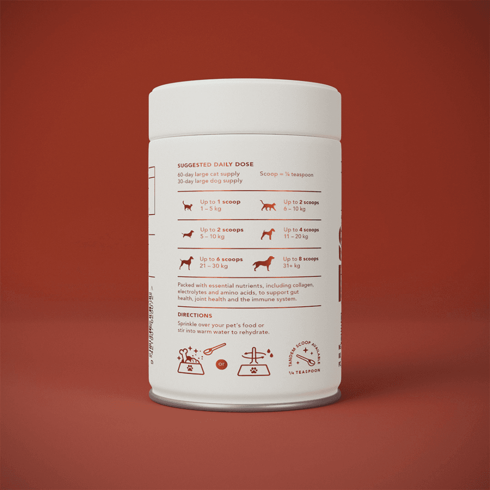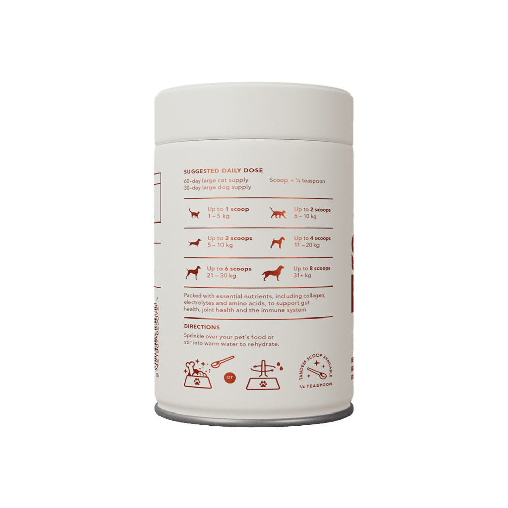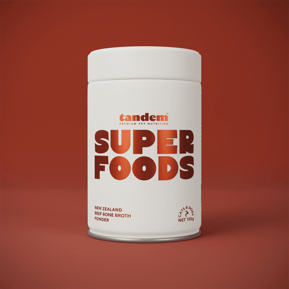 - Tandem Super Foods New Zealand Beef Bone Broth Powder can be sprinkled dry over kibble, mixed into wet food, or rehydrated with warm water