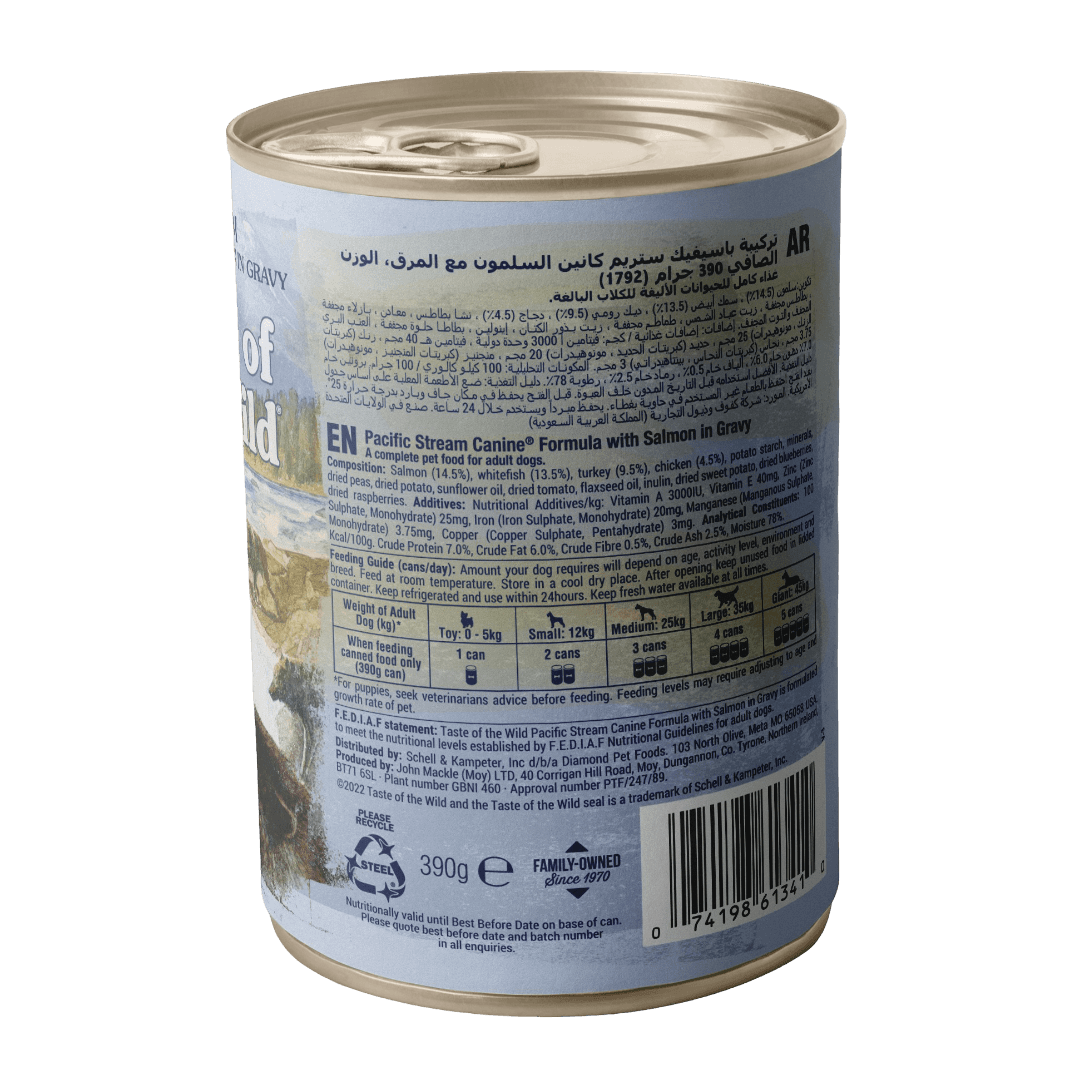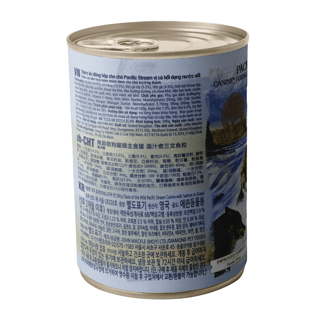 The Taste of the Wild Pacific Stream Salmon in Gravy Wet Dog Food brings rich grain free nourishment with real salmon in a savoury gravy dogs adore. This complete balanced recipe supports lean muscles, steady energy, and overall vitality with natural ingredients inspired by a canine ancestral diet.