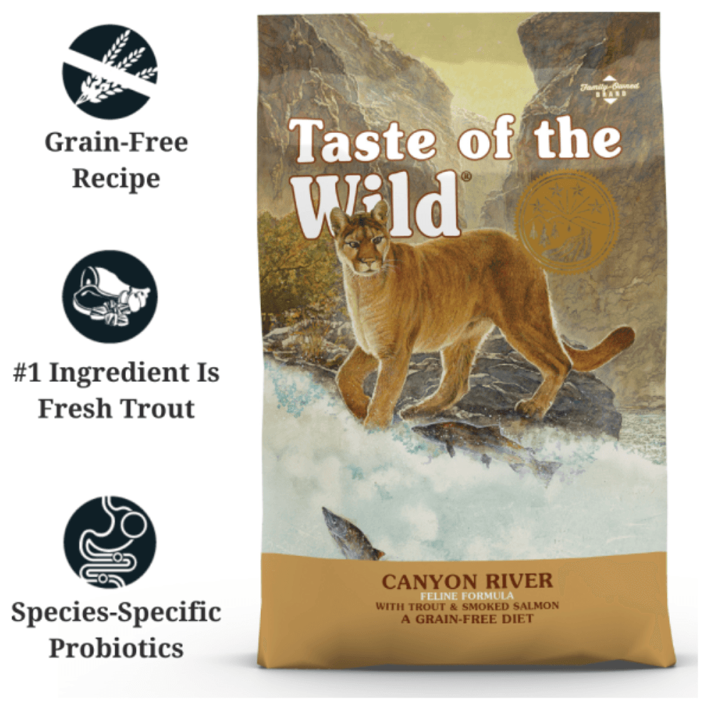 The Taste of the Wild Canyon River Feline Formula with Trout & Smoked Salmon is a grain-free diet designed to mimic a natural feline diet with premium proteins and a blend of omega fatty acids for optimal skin and coat health.