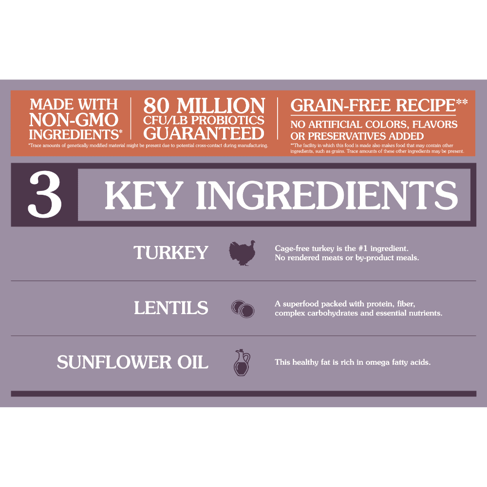 Turkey, lentils, chicken fat (preserved with mixed tocopherols), natural flavor, salmon oil (source of DHA), DL-Methionine, dicalcium phosphate, calcium carbonate, salt, choline chloride, taurine, dried Lactobacillus plantarum fermentation product, dried Bacillus subtilis fermentation product, dried Lactobacillus acidophilus fermentation product, dried Enterococcus faecium fermentation product, dried Bifidobacterium animalis fermentation product, zinc proteinate, vitamin E supplement, niacin, manganese proteinate, copper proteinate, zinc sulfate, manganese sulfate, copper sulfate, thiamine mononitrate, vitamin A supplement, biotin, potassium iodide, calcium pantothenate, riboflavin, pyridoxine hydrochloride, vitamin B12 supplement, sodium selenite, vitamin D3 supplement, folic acid.