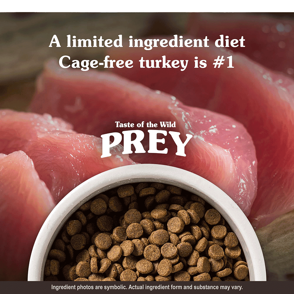 Taste of the Wild Prey Turkey Formula All Lifestages Dry Dog Food is a complete and balanced limited ingredient dry food designed for dogs of all lifestages, including large breed puppies. This grain free formula features cage free turkey as the primary protein source and is enriched with species specific probiotics to support sensitive tummies and optimal digestive health.