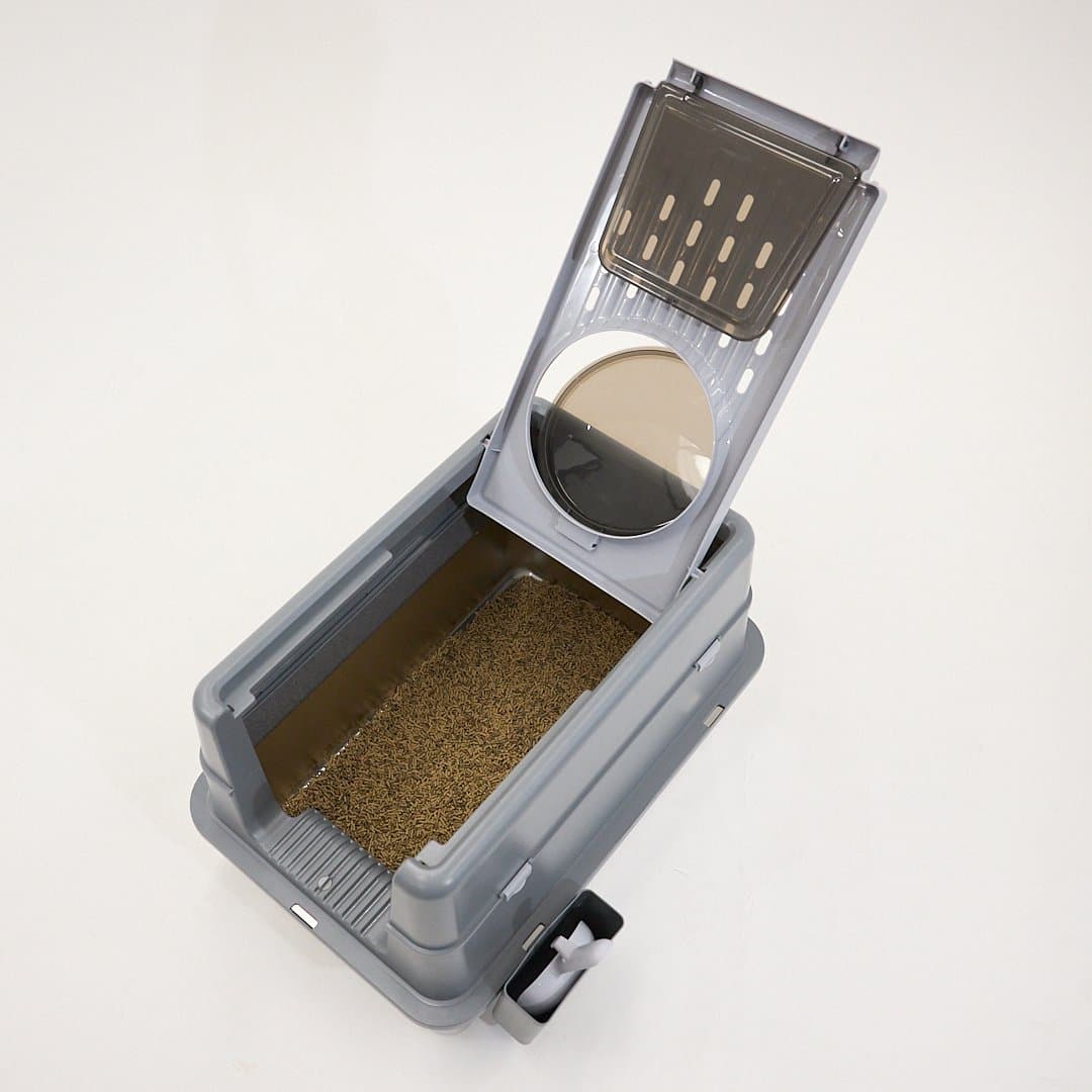 - This litter box includes a matching litter scoop and a convenient external holder for easy storage