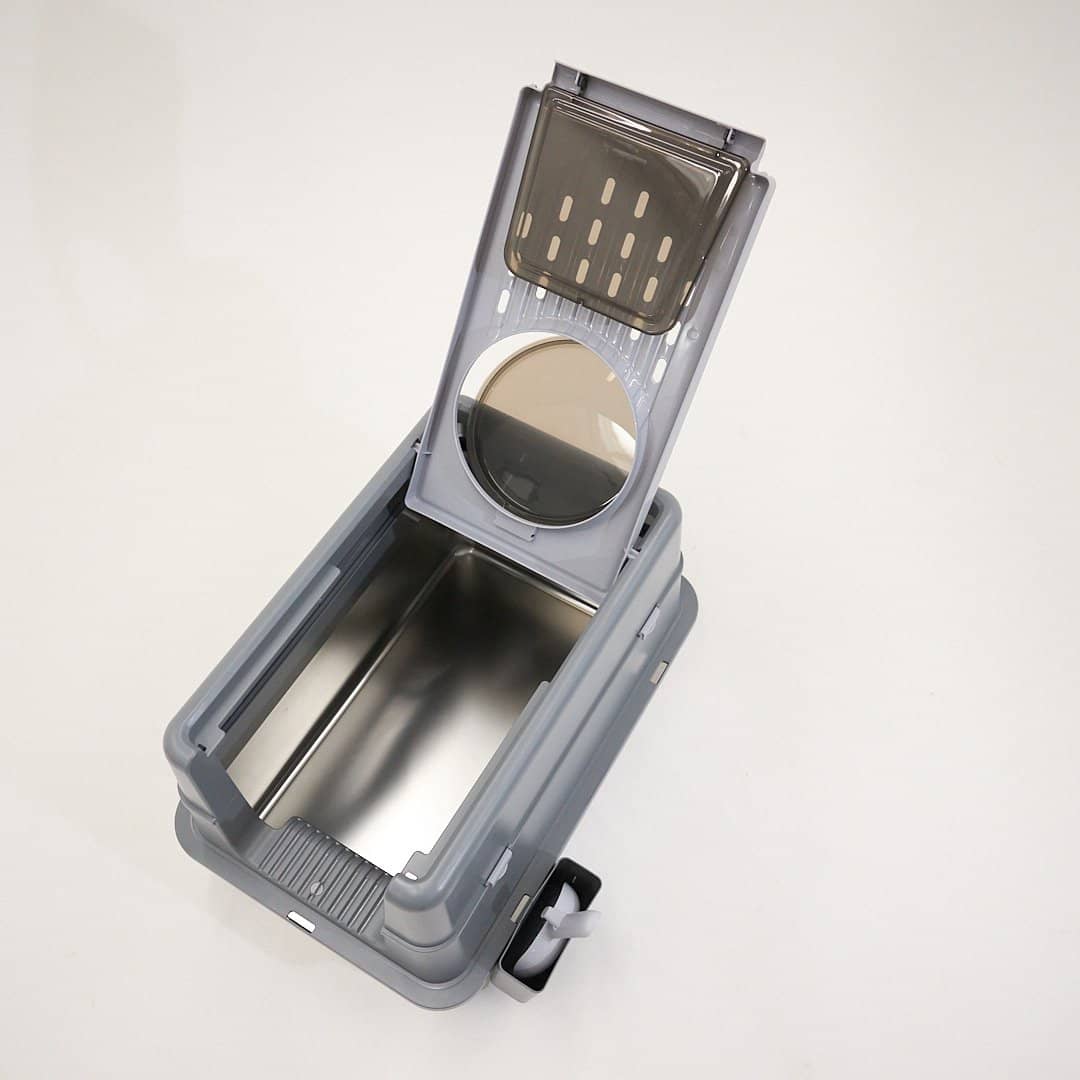 - The lid can swing up like this to allow litter on the lid to fall back in for easy cleaning