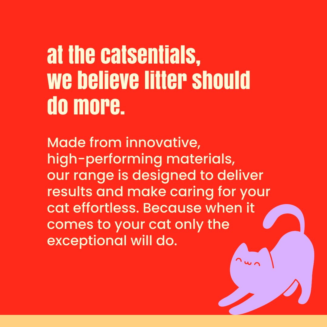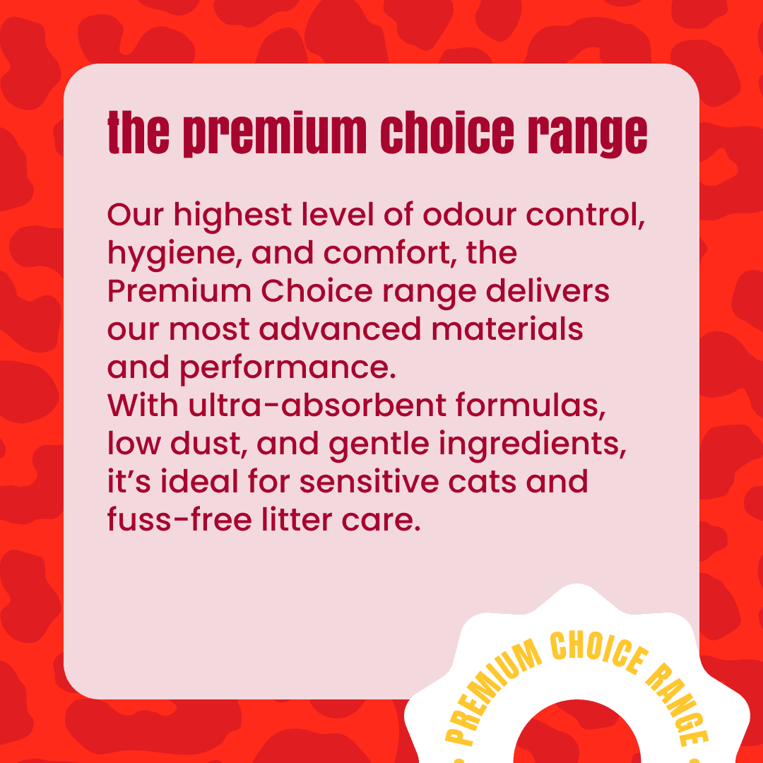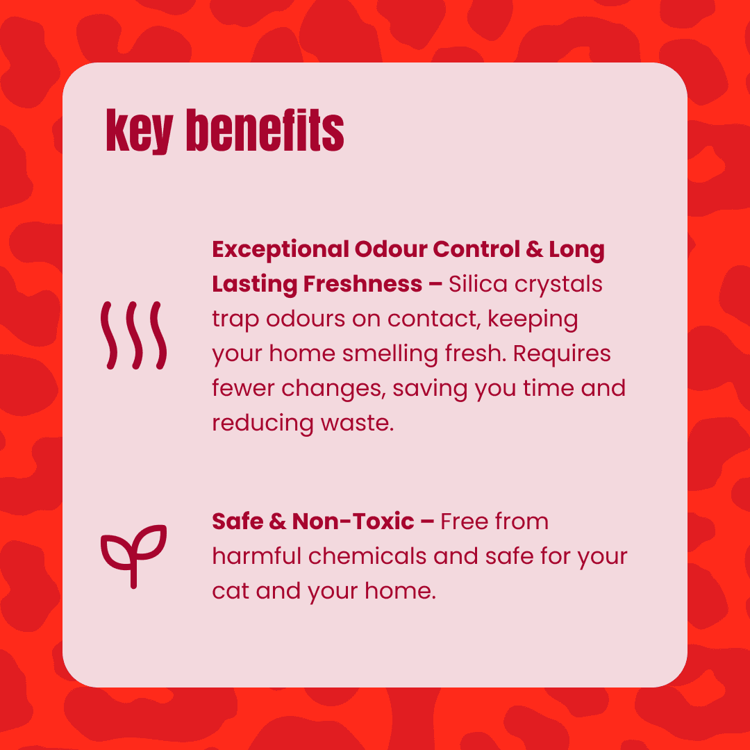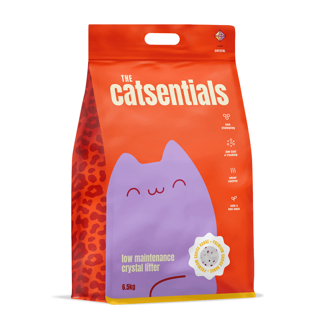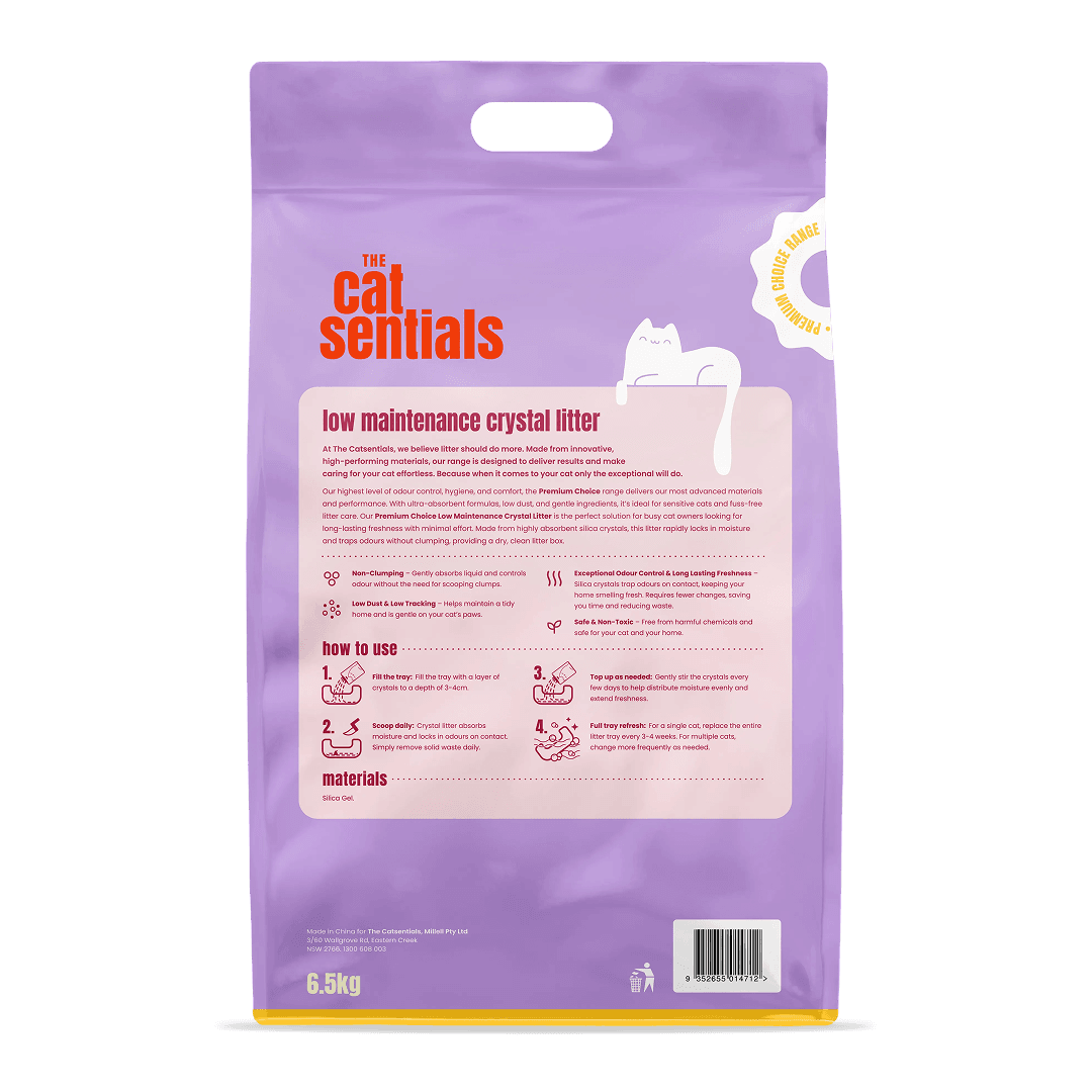 THE CATSENTIALS: EXCEPTIONAL CARE MADE EFFORTLESS - At The Catsentials, we believe litter should do more. Made from innovative, high-performing materials, our range is designed to deliver results and make caring for your cat effortless. Because when it comes to your cat only the exceptional will do. PREMIUM CHOICE - ADVANCE INNOVATION FOR THE MODERN HOME (RED): The Premium Choice range represents the pinnacle of litter technology. Designed for owners who prioritise health, time-saving, and ultimate performance, these products offer specialised benefits that go beyond standard tray maintenance. PRODUCT: LOW MAINTENANCE CRYSTAL - The ultimate "set and forget" solution. Our advanced silica crystals are designed for maximum efficiency, instantly dehydrating solid waste and locking away liquid and odours. This creates a low-maintenance routine, requiring only the removal of solids while the crystals work for weeks to keep the tray dry and scent-free.
