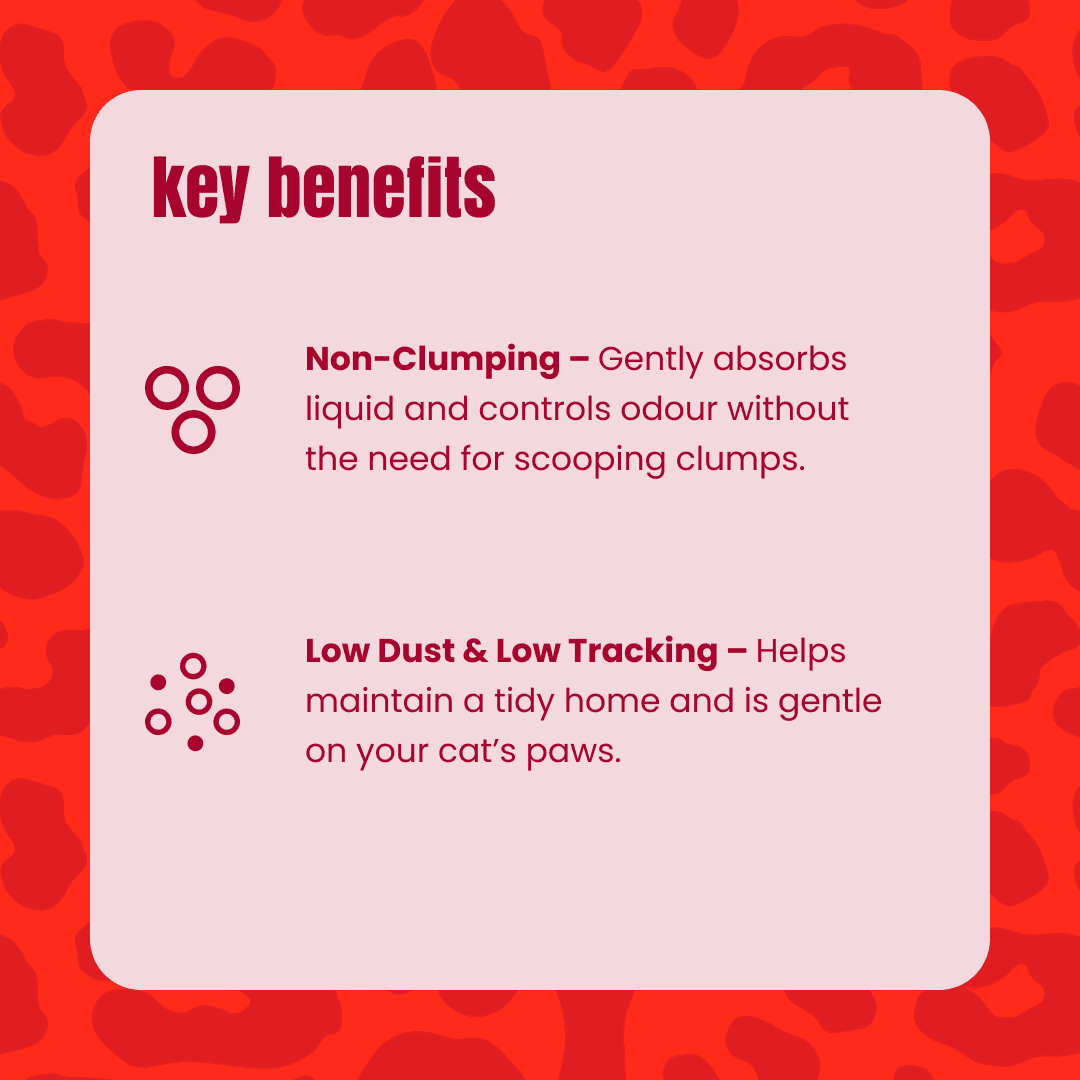 - Non-Clumping – Gently absorbs liquid and controls odour without the need for daily scooping; simply stir to refresh