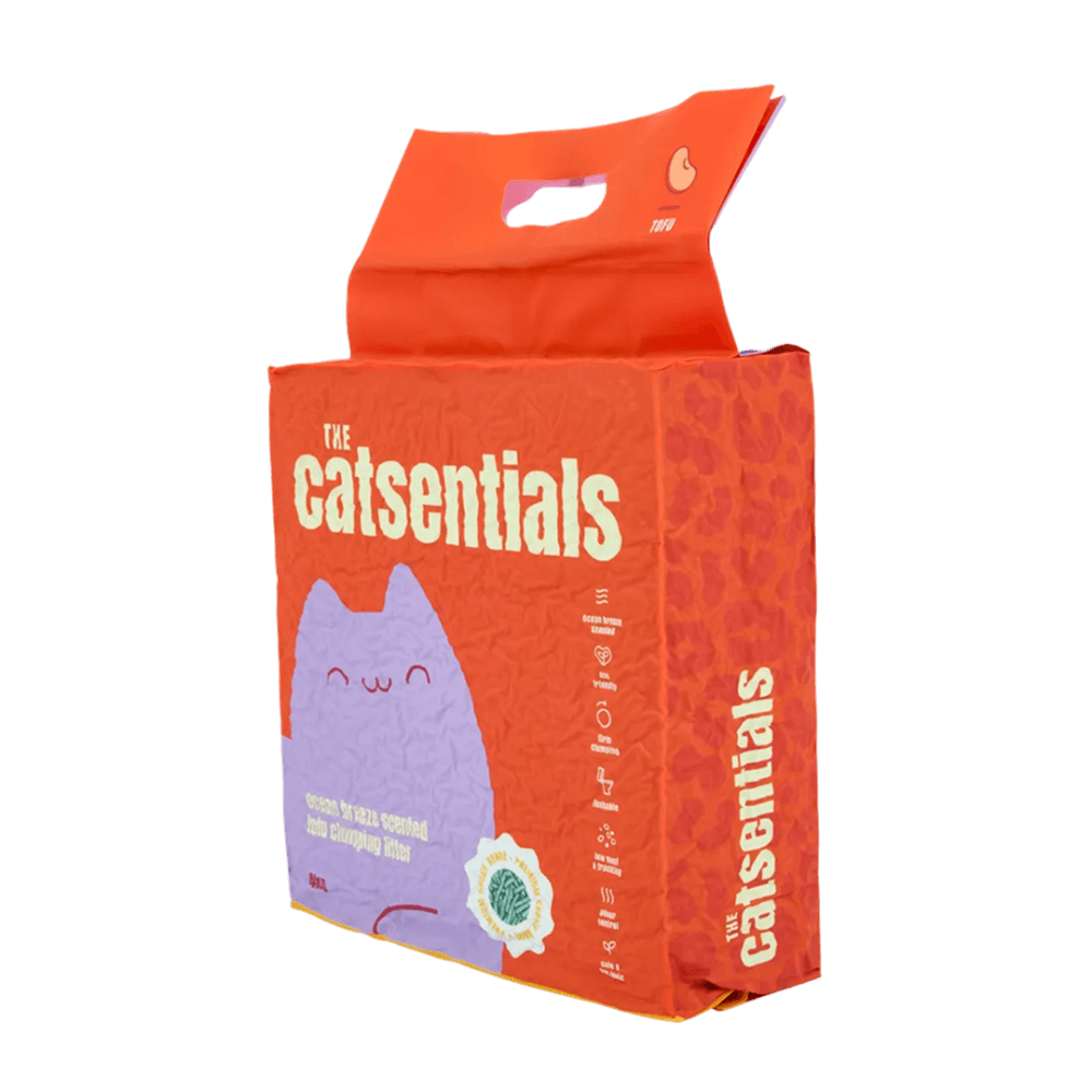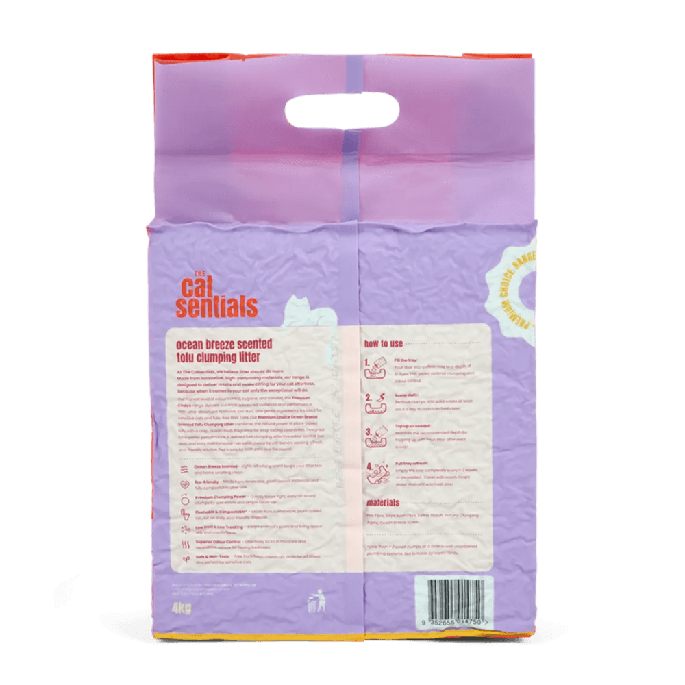 THE CATSENTIALS: EXCEPTIONAL CARE MADE EFFORTLESS - At The Catsentials, we believe litter should do more. Made from innovative, high-performing materials, our range is designed to deliver results and make caring for your cat effortless. Because when it comes to your cat only the exceptional will do. PREMIUM CHOICE - ADVANCE INNOVATION FOR THE MODERN HOME (RED): The Premium Choice range represents the pinnacle of litter technology. Designed for owners who prioritiSe health, time-saving, and ultimate performance, these products offer specialised benefits that go beyond standard tray maintenance. PRODUCT: OCEAN BREEZE TOFU (PREMIUM GRADE) - Turn the litter box into a subtle sensory experience. Our Premium Scented Tofu range combines our highest-grade clumping fibers with light, sophisticated fragrances. Designed for owners who want their home to feel fresh and inviting, these litters offer elite absorption with a touch of botanical luxury.