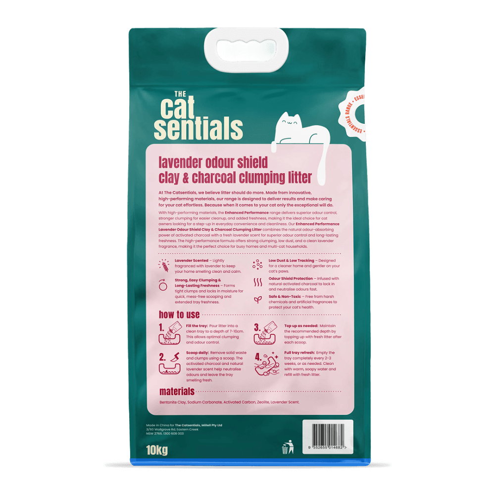 THE CATSENTIALS: EXCEPTIONAL CARE MADE EFFORTLESS - At The Catsentials, we believe litter should do more. Made from innovative, high-performing materials, our range is designed to deliver results and make caring for your cat effortless. Because when it comes to your cat only the exceptional will do. THE ENHANCED PERFORMANCE RANGE (GREEN) - TARGETED SOLUTIONS FOR ACTIVE HOMES: The Enhanced Performance range is engineered for households that need a little extra support. Whether you have multiple cats or a smaller living space, these formulas feature specialised additives to tackle odors and mess with increased efficiency. PRODUCT: CLAY & CHARCOAL (LAVENDER SCENTED) - Take control of your home’s atmosphere with our Odour Shield Clay litter. We have fortified our high-quality bentonite clay with activated charcoal to provide an extra layer of defense against stubborn odours. Available in a Clean Unscented version or with a Soothing Lavender scent to suit your preference.