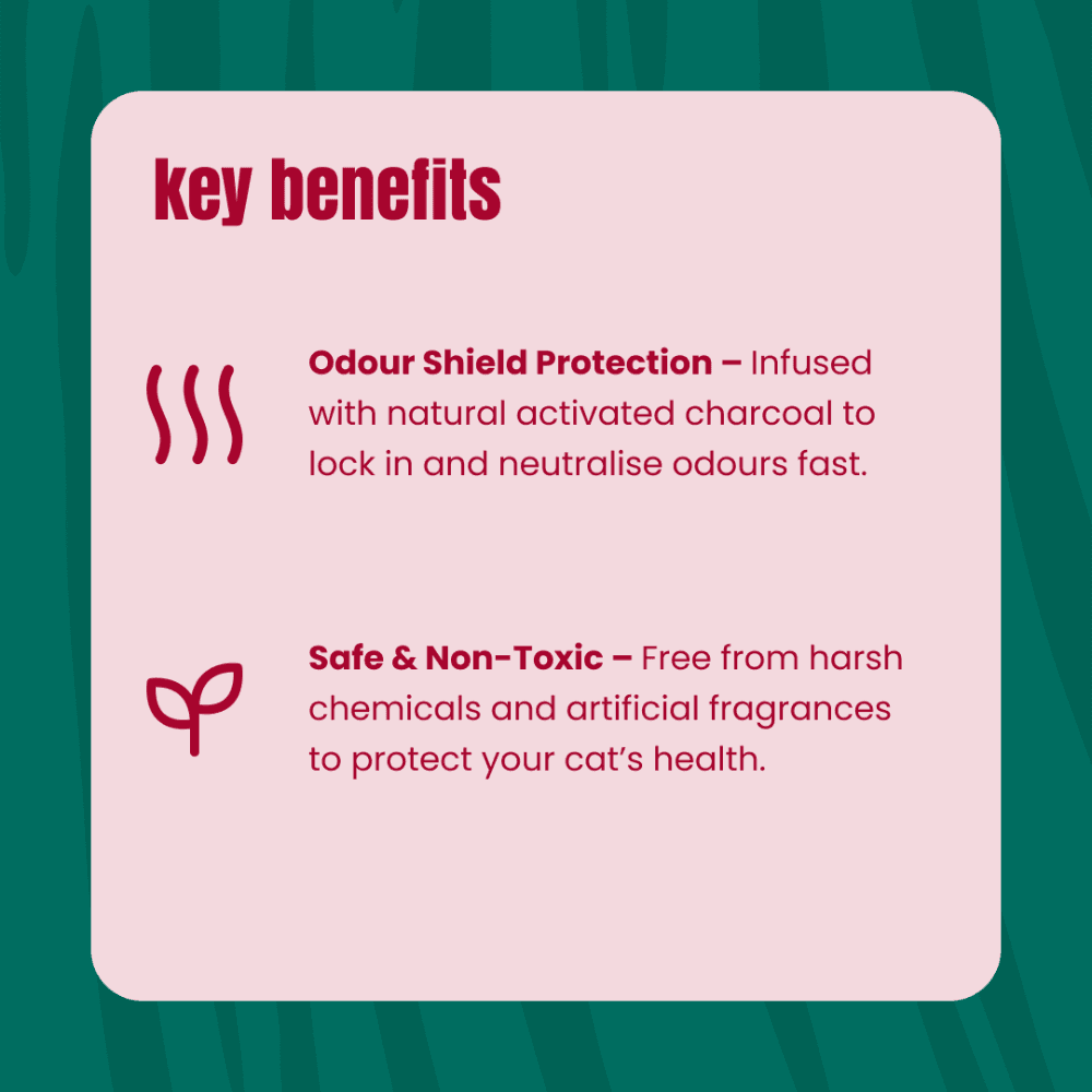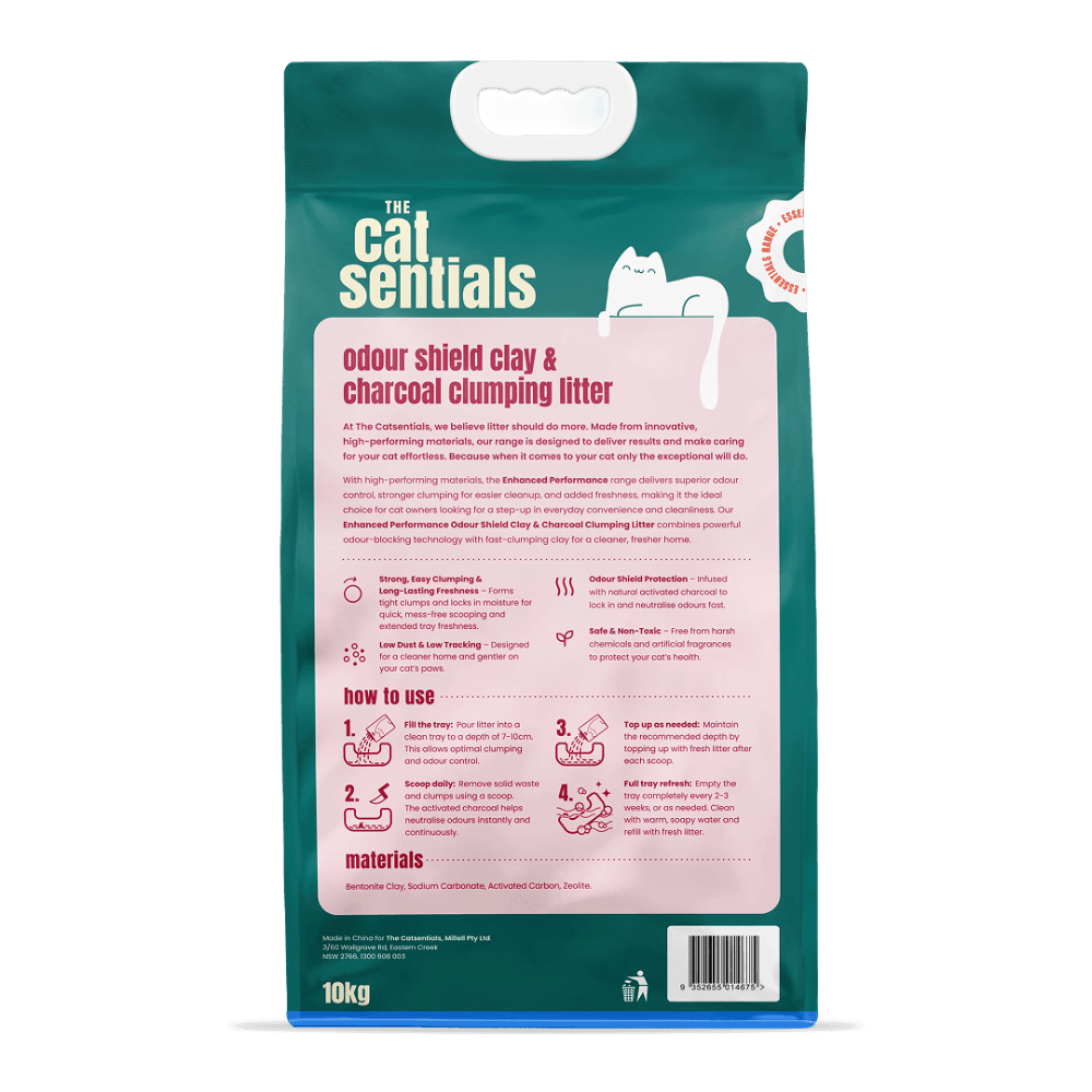 THE CATSENTIALS: EXCEPTIONAL CARE MADE EFFORTLESS - At The Catsentials, we believe litter should do more. Made from innovative, high-performing materials, our range is designed to deliver results and make caring for your cat effortless. Because when it comes to your cat only the exceptional will do. THE ENHANCED PERFORMANCE RANGE (GREEN) - TARGETED SOLUTIONS FOR ACTIVE HOMES: The Enhanced Performance range is engineered for households that need a little extra support. Whether you have multiple cats or a smaller living space, these formulas feature specialised additives to tackle odours and mess with increased efficiency. PRODUCT: CLAY & CHARCOAL - Take control of your home’s atmosphere with our Odour Shield Clay litter. We have fortified our high-quality bentonite clay with activated charcoal to provide an extra layer of defense against stubborn odours. Available in a Clean Unscented version or with a Soothing Lavender scent to suit your preference.