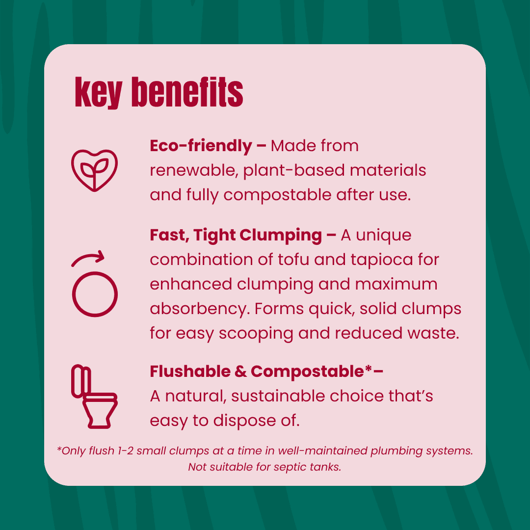 - Fast, Tight Clumping - A unique combination of tofu and tapioca for enhanced clumping and maximum absorbency. Forms quick, solid clumps for easy scooping and reduced waste