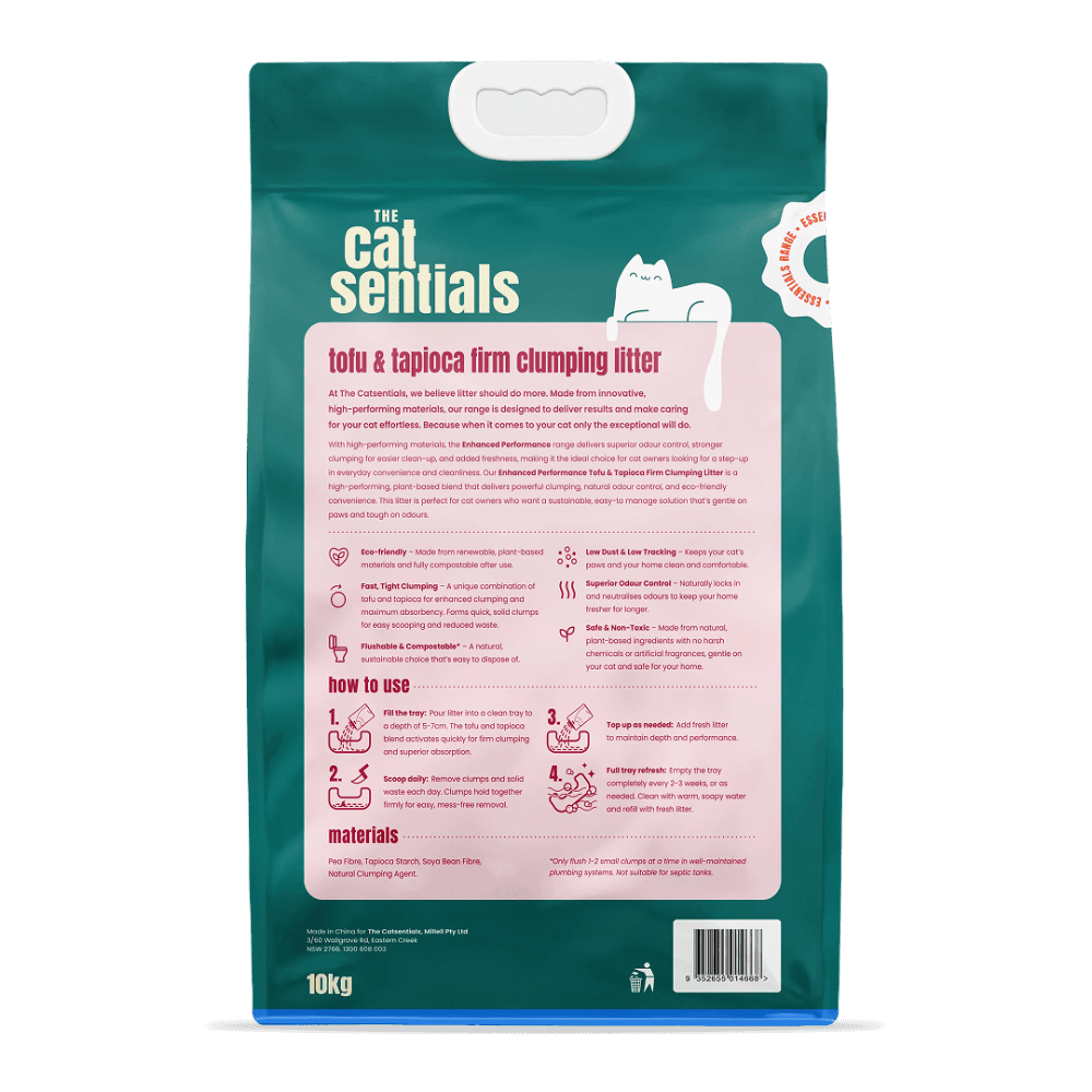 THE CATSENTIALS: EXCEPTIONAL CARE MADE EFFORTLESS - At The Catsentials, we believe litter should do more. Made from innovative, high-performing materials, our range is designed to deliver results and make caring for your cat effortless. Because when it comes to your cat only the exceptional will do. THE ENHANCED PERFORMANCE RANGE (GREEN) - TARGETED SOLUTIONS FOR ACTIVE HOMES: The Enhanced Performance range is engineered for households that need a little extra support. Whether you have multiple cats or a smaller living space, these formulas feature specialised additives to tackle odours and mess with increased efficiency. PRODUCT: TOFU & TAPIOCA (FIRM CLUMPING) - Experience our strongest plant-based bond. By combining natural soy fibers with the power of tapioca starch, this formula creates ultra-firm, "rock-solid" clumps that won't break apart. This ensures a cleaner tray and less wasted litter, making it a high-efficiency choice for the discerning cat owner.