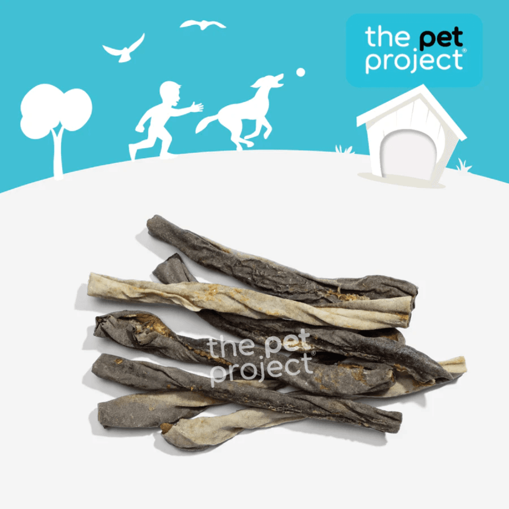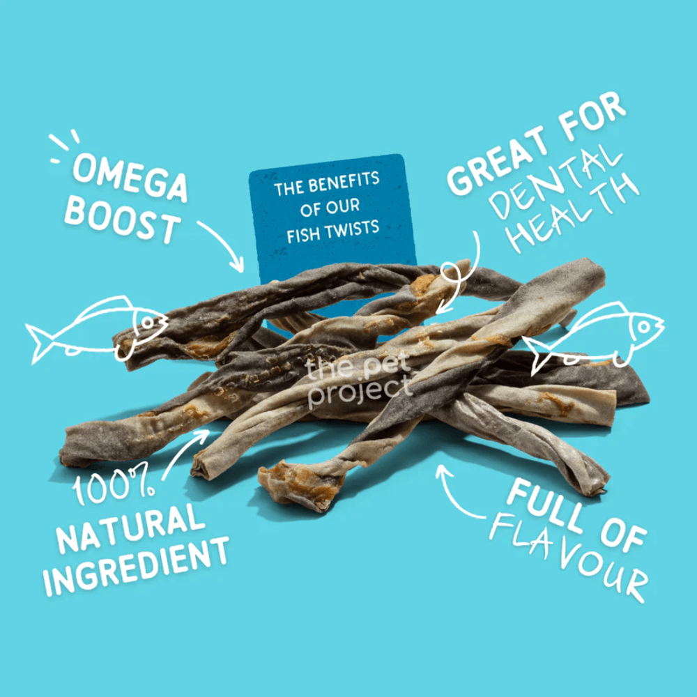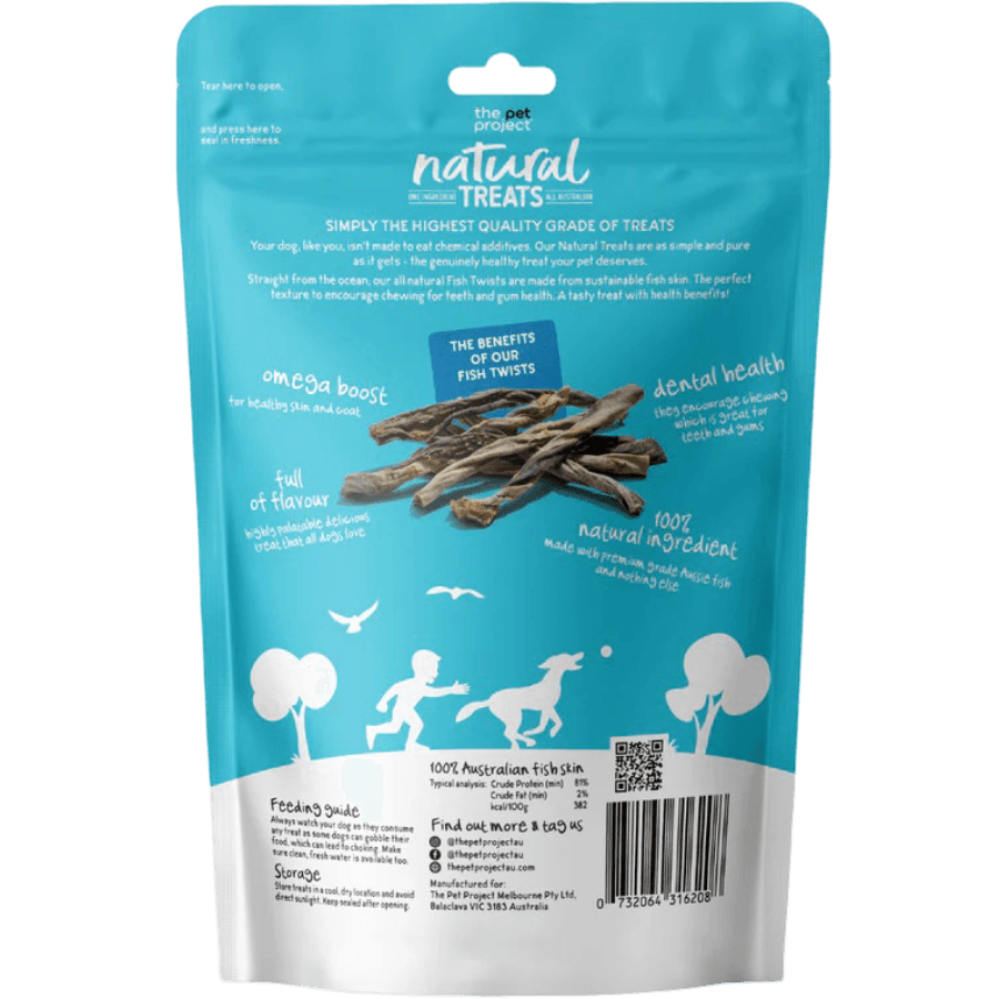 The Pet Project Fish Twists Dog Treats are a premium, single-ingredient snack crafted from 100% Australian fish skin to provide a crunchy and nutritious reward. These natural treats are gently dried to maintain their inherent omega-3 fatty acids, supporting your dog's skin and coat health while offering a satisfying texture.
