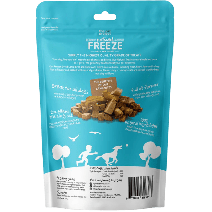 - The Pet Project Freeze Dried Lamb Bites Dog Treats contain only two ingredients including 100% Australian lamb meat and nutrient-dense organs