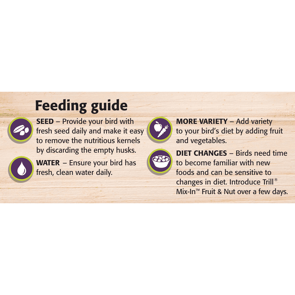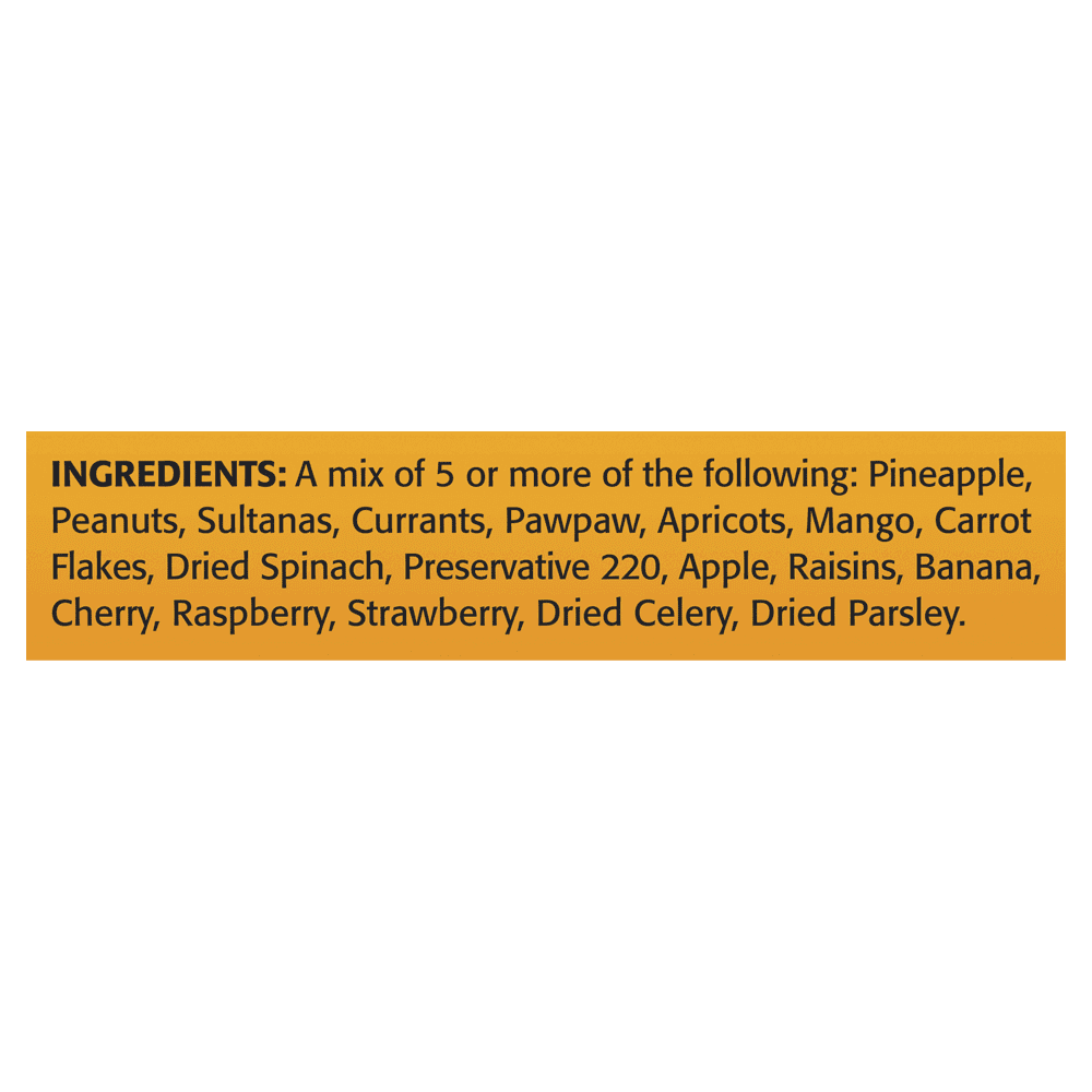 A mix of 5 or more of the following: Pineapple, Peanuts, Sultanas, Currants, Pawpaw, Apricots, Mango, Carrot Flakes, Dried Spinach, Preservative 220, Apple, Raisins, Banana, Cherry, Raspberry, Strawberry, Dried Celery, Dried Parsley.