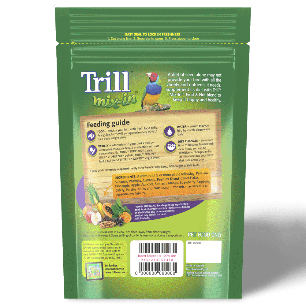 A mix of 5 or more of the following: Pineapple, Peanuts, Sultanas, Currants, Pawpaw, Apricots, Mango, Carrot Flakes, Dried Spinach, Preservative 220, Apple, Raisins, Banana, Cherry, Raspberry, Strawberry, Dried Celery, Dried Parsley.