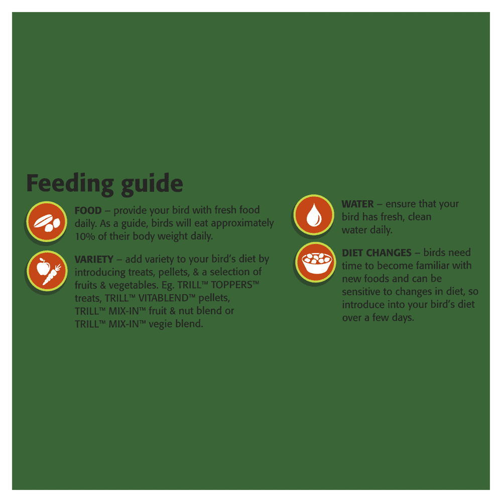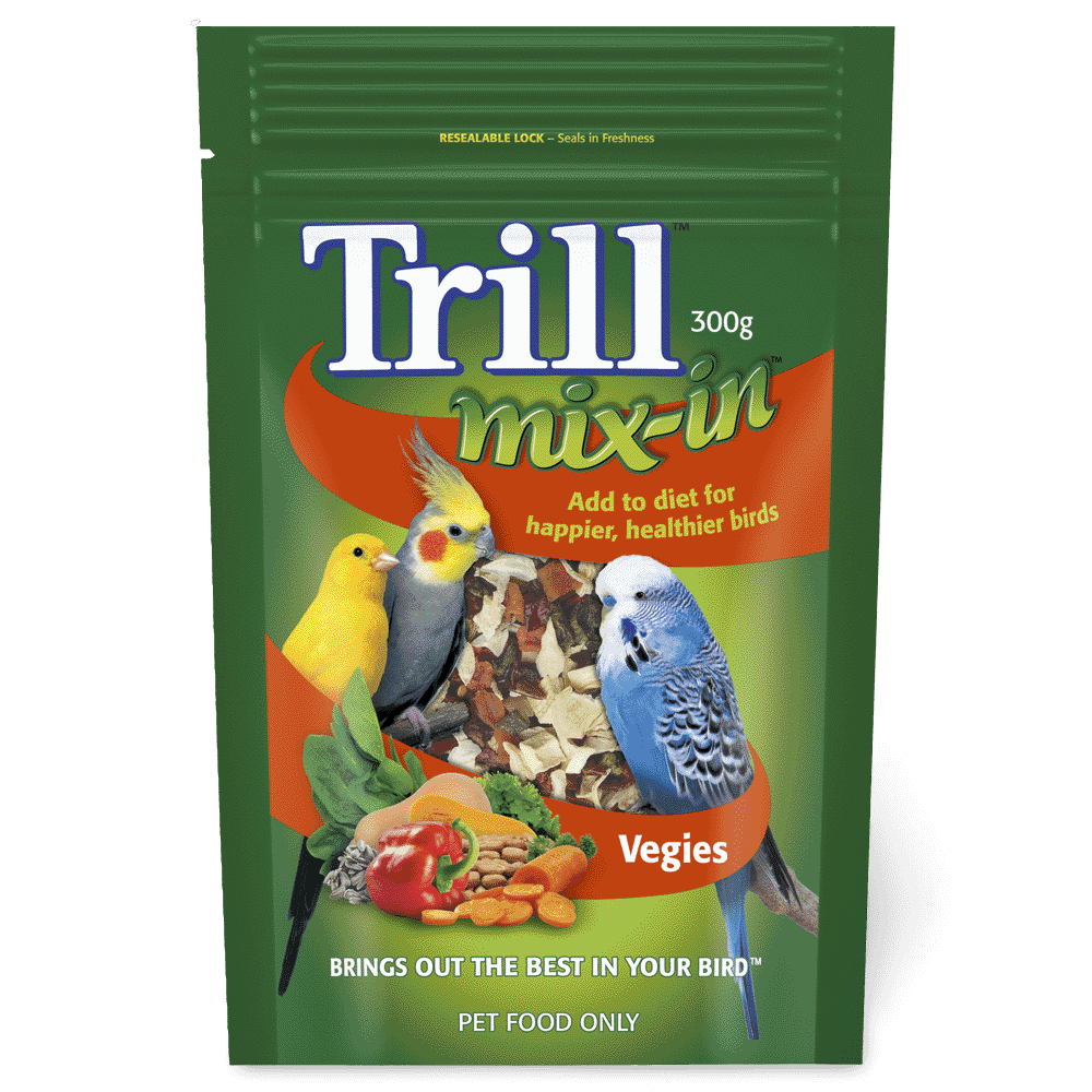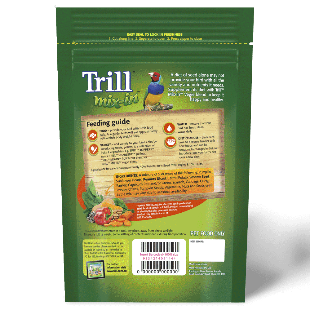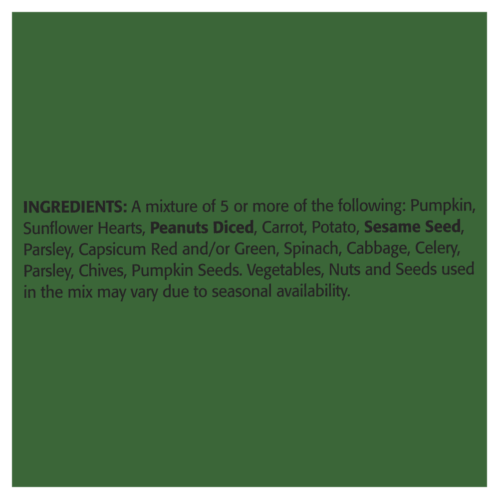 A mix of 5 or more of the following: Pumpkin, Peanuts, Sunflower Hearts, Carrot, Potato, Sesame Seeds, Capsicum, Spinach, Cabbage, Celery, Parsley, Chives, Pumpkin Seeds.