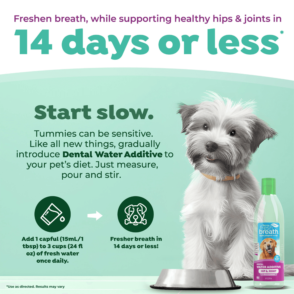 TropiClean's water additive is expertly crafted to promote both oral health and joint support for your pet. For more insights into supporting your pet's health, explore our comprehensive collection, including joint care and dental health solutions, along with helpful tips in our "Dental Care for Dogs" article.