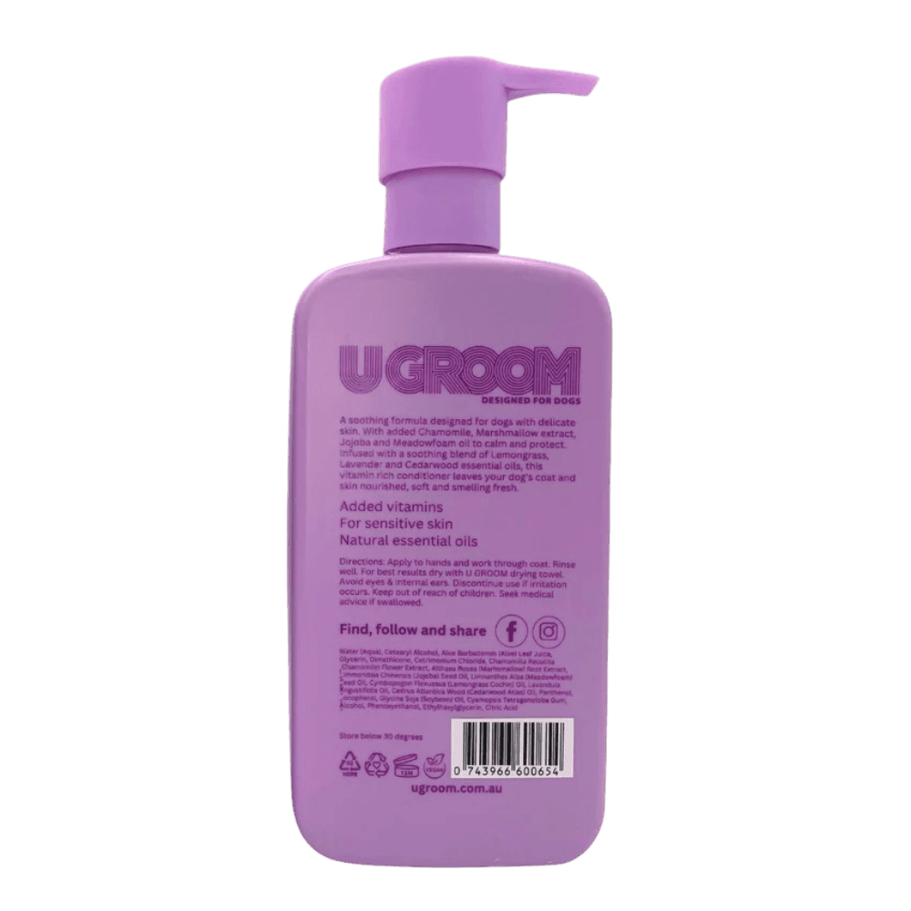 The U Groom Sensitive All Breed Soothing Conditioner is a vitamin-rich, soothing formula designed specifically for dogs with delicate skin. It uses added Chamomile, Marshmallow extract, and natural oils to calm, protect, and nourish your dog's coat, leaving it soft and fresh.