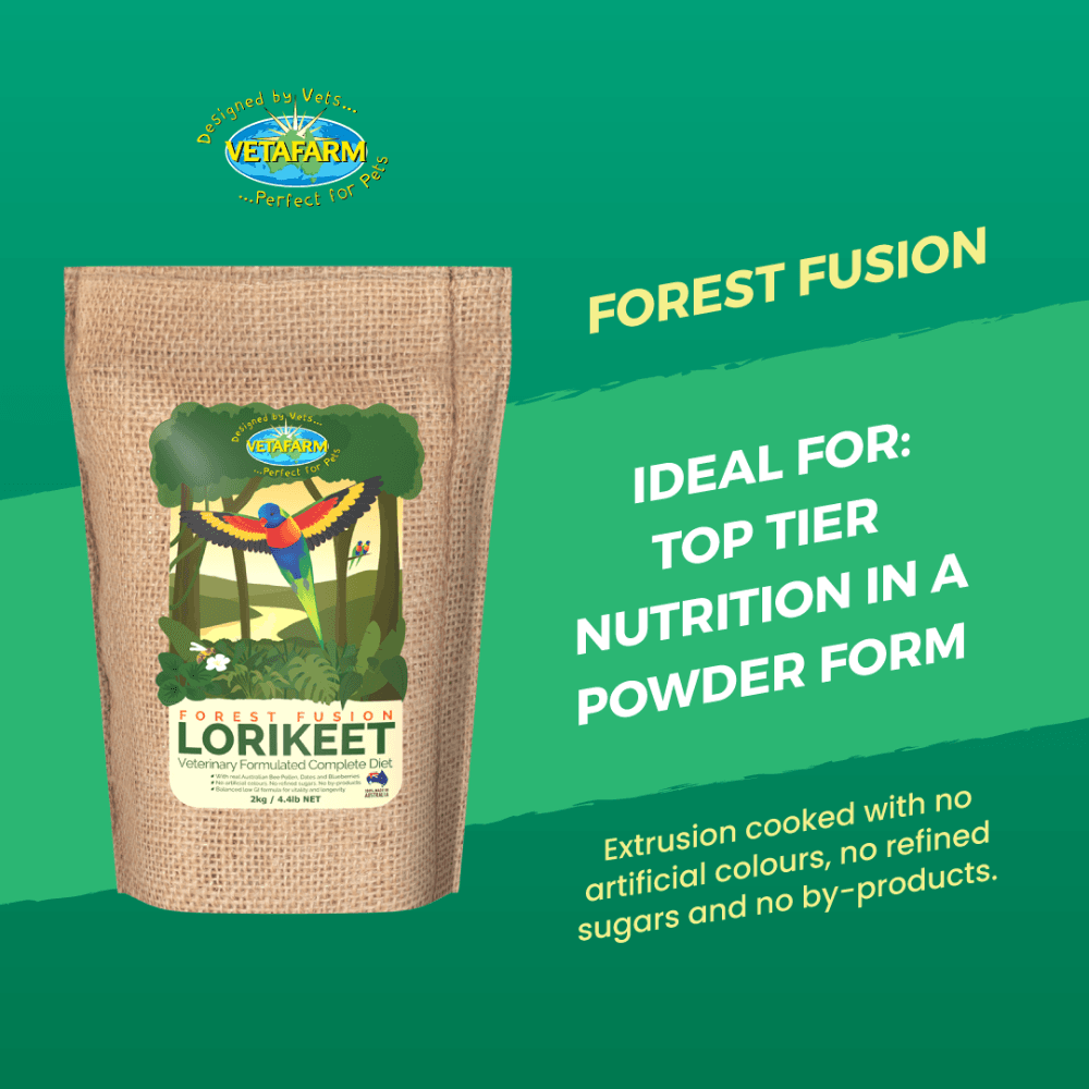 Vetafarm Forest Fusion Lorikeet offers a complete, vet-formulated diet. Proudly Australian made by Vetafarm, this low-sugar food mimics natural foraging with wholesome ingredients like bee pollen & blueberry, supporting vibrant health for your lorikeet without unnecessary refined sugars.