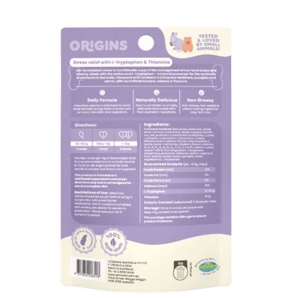 Help your little pal find their calm with Vetafarm Origins B-Calm Chews For Small Animals! These veterinarian-formulated functional chews are designed to naturally support rabbits, guinea pigs, and other small animals through moments of low-level stress and anxiety, offering a delicious, non-drowsy solution for daily use.