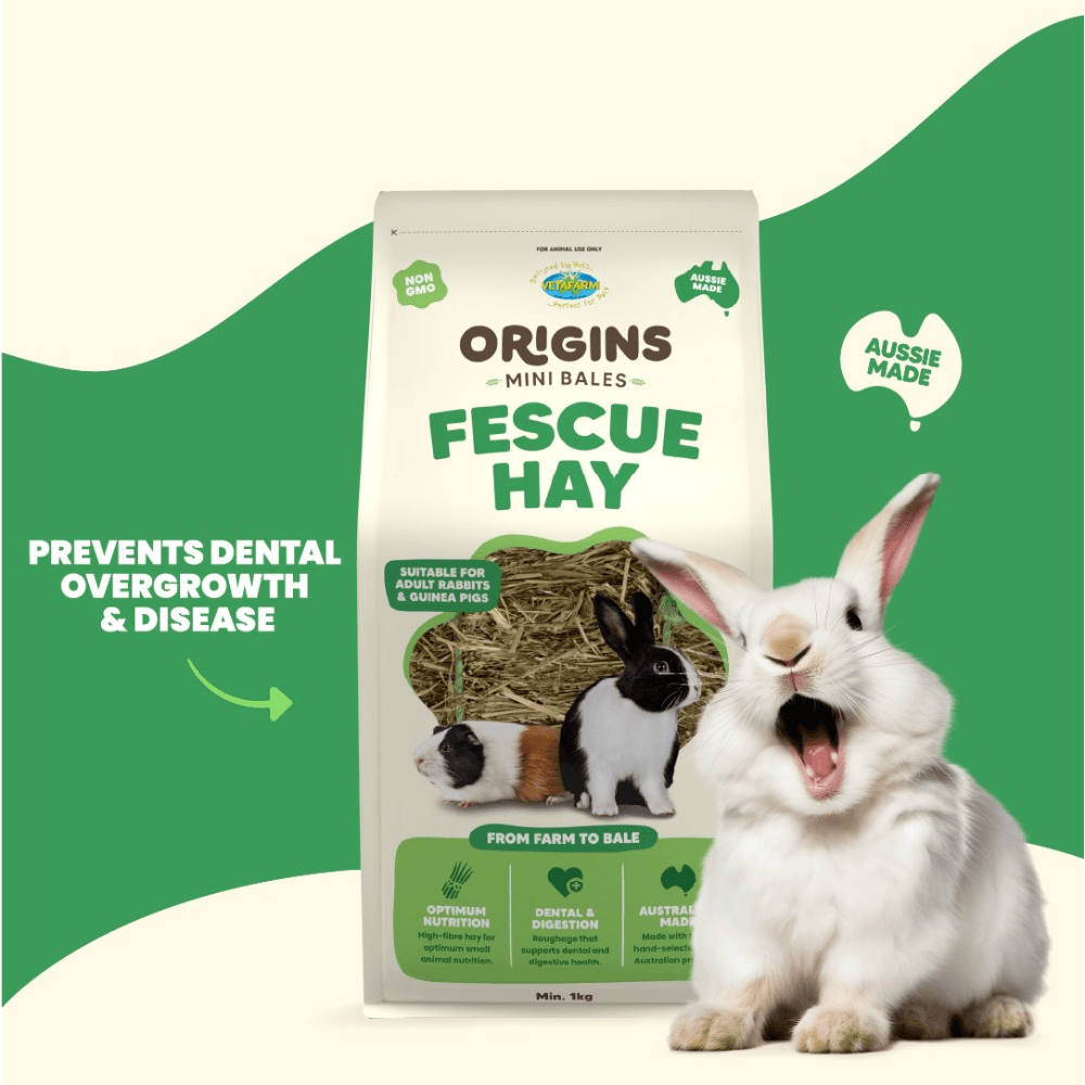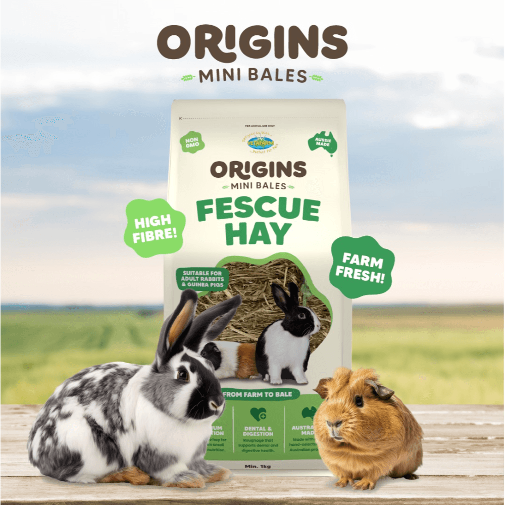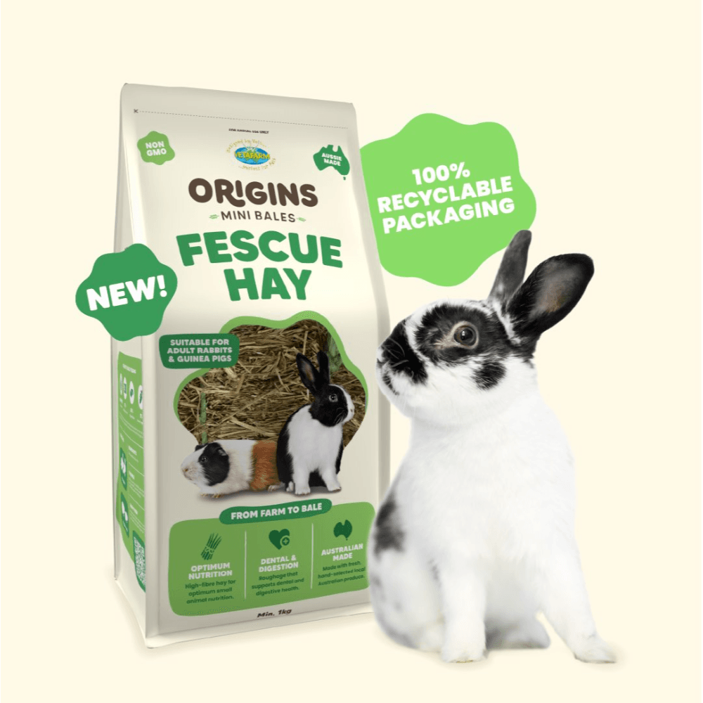 Treat your small whiskered pals to the hay they were born to crunch with Vetafarm Origins Fescue Hay Mini Bale. Grown, harvested and packed right on our Riverina farm, this compact, high-fibre, low-protein grass hay keeps tummies moving and teeth in check - perfect for adult rabbits and guinea pigs of all ages. Plus, it arrives in a 100% kerbside-recyclable pack, so you're doing good for your pets and the planet.