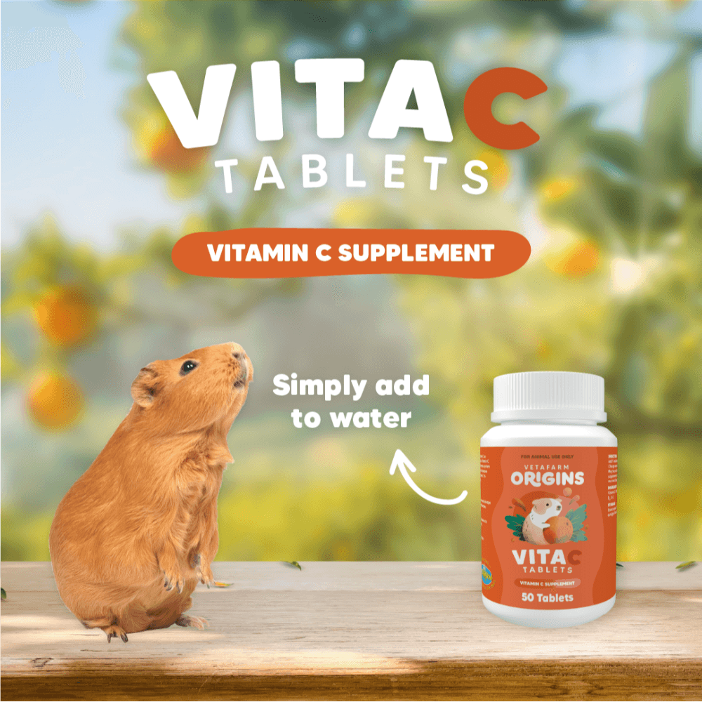 Vetafarm Origins Vita C Tablets ensure your guinea pig gets crucial daily Vitamin C. As an Australian, vet-founded brand, Vetafarm prioritises quality ingredients & targeted health. These palatable tablets prevent deficiency, supporting wellness in pets that can't produce their own Vitamin C.