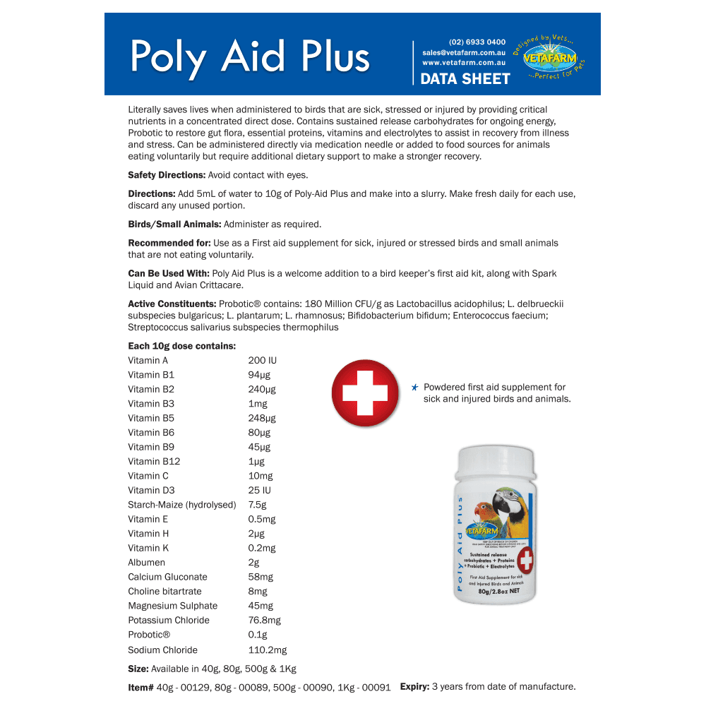- Suitable as a first aid supplement for sick or stressed birds and small animals