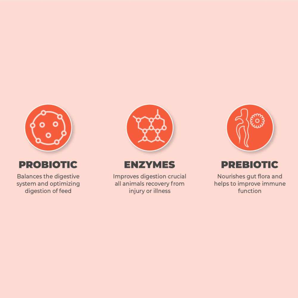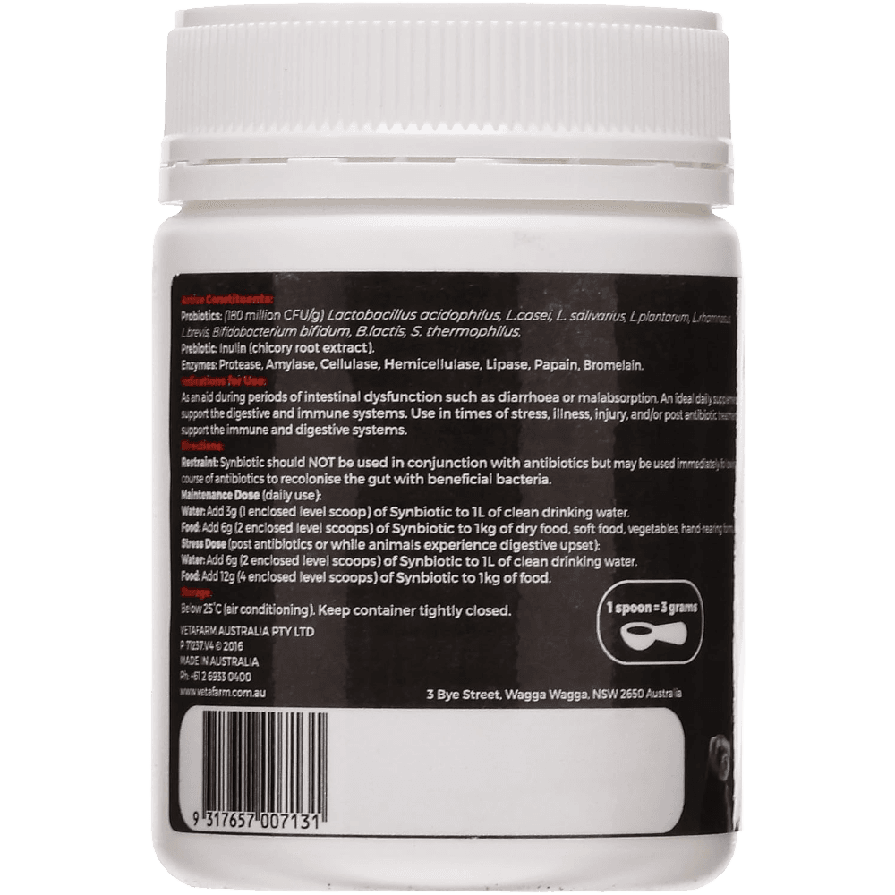 Synbiotic 180 S is a friendly 9 strain probiotic blend boosted with natural prebiotic chicory root extract and digestive enzymes. The probiotics help balance the gut and optimise the digestion of feed, while the prebiotic nourishes good gut flora to support immune function and encourage the growth of beneficial bacteria - especially handy after antibiotics or illness. Added enzymes give food a helping hand, which is invaluable for animals recovering from stress or injury.
