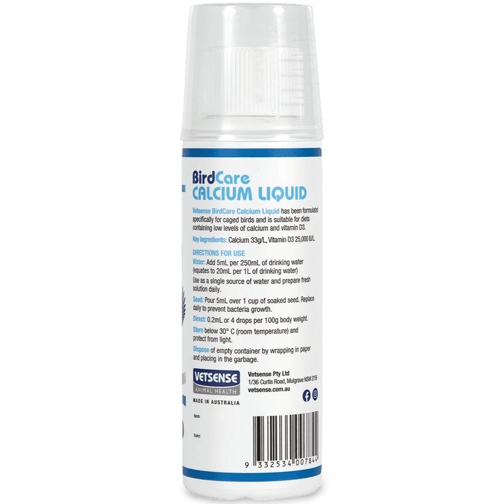 Vetsense Birdcare Calcium Liquid 125mL is a scientifically formulated supplement that addresses the specific calcium and Vitamin D3 needs of birds. This liquid supplement supports strong bone health, efficient calcium absorption, and eggshell formation, promoting overall vitality in birds.