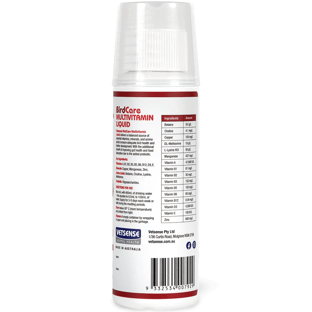 Vetsense Birdcare Multivitamin Liquid 125mL is a specially formulated supplement designed to support your birds overall health. It provides a balanced blend of essential vitamins, amino acids, and prebiotics to promote immunity, healthy feathers, and digestive health.